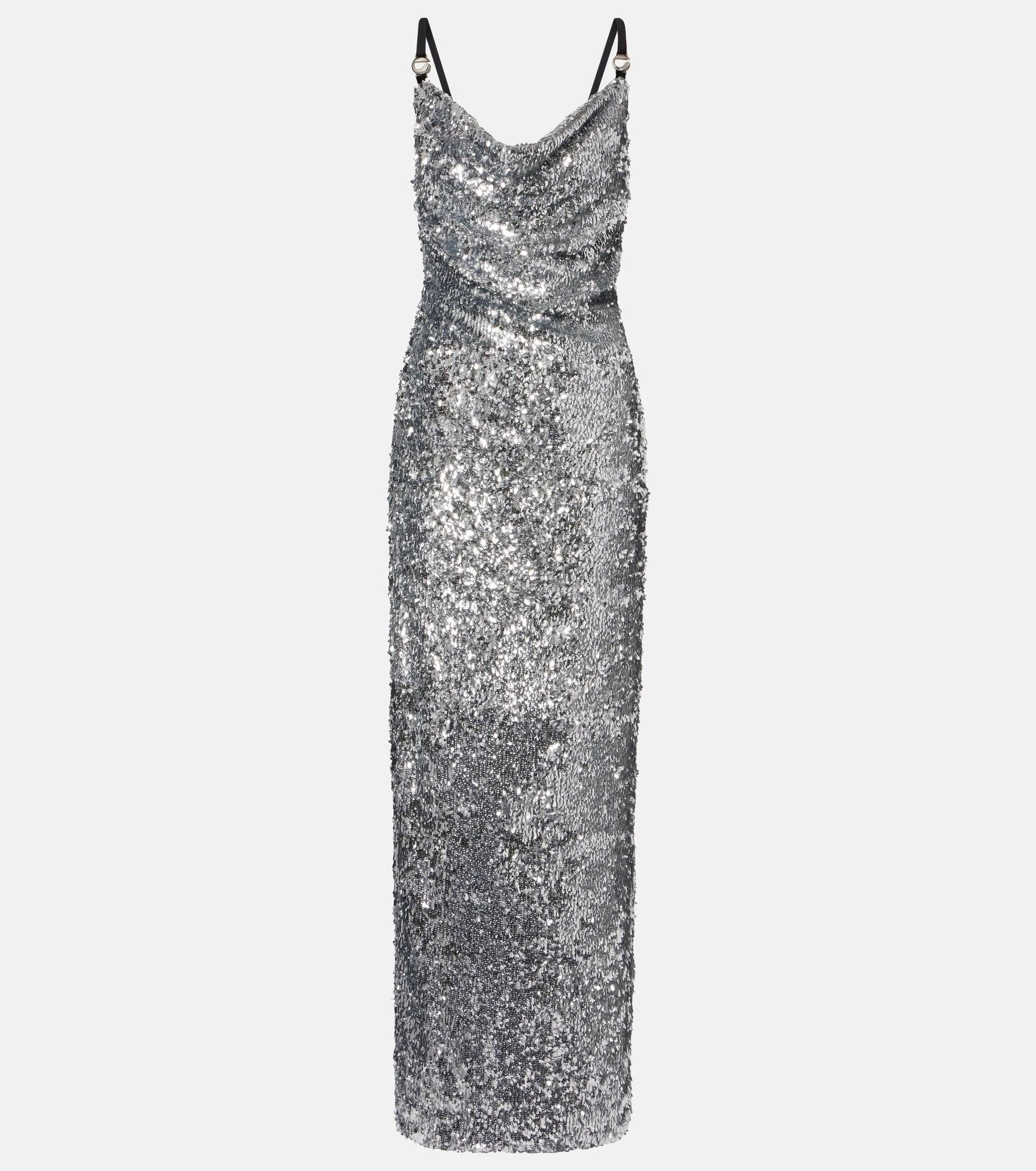 Coperni takes its name after the astronomer Nicolaus Copernicus, whose precise work inspires the brand’s deeply detailed designs. This gown embodies the brand’s avantgarde aesthetic with its scintillating sequined construction, sculpted fit, and graceful draping at the chest. Product Details - Material: 97% polyamide, 3% elastane - Care instructions: hand wash cold - Made in Italy - Designer color name: Silver - Item color: silver - Lining: 82% polyamide, 18% elastane - Item number: P01142067 Size & Fit - True to size - Low back - Cinched waist - Non-stretchy fabric - The model seen in the picture is 178cm-5'10" and wearing a size FR 36