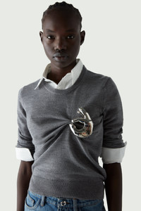 Woolen grey jumper with jewellery adornment. Expected dispatch: 2 nd of October. Adding a playful and irreverent edge to a classic pure wool grey knit, is this silver-toned emoji 'ok' sign, crafted in a special jewellery atelier in Italy. It appears to clasp the material, which is gathered in a twist for a close fitting style. Details Grey COPML76643 Made in Italy Size and Fit True to size. Model is 175 cm / 5'7" ft and is wearing size FR36