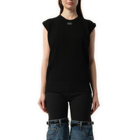 Stay stylish and comfortable with our Knitted Sleeveless Top in Black. Made with fine knitted fabric, this top is perfect for any season. Its sleeveless design allows for ultimate breathability, while the classic black color makes it a versatile addition to any wardrobe. - Composition: 65% Viscose, 35% Polyamide - Ribbed trim - Crew neck - Logo patch to the front - Straight hem - Made in Italy Model is 175 cm and wears size S SKU: COPML115Y3003 BLK