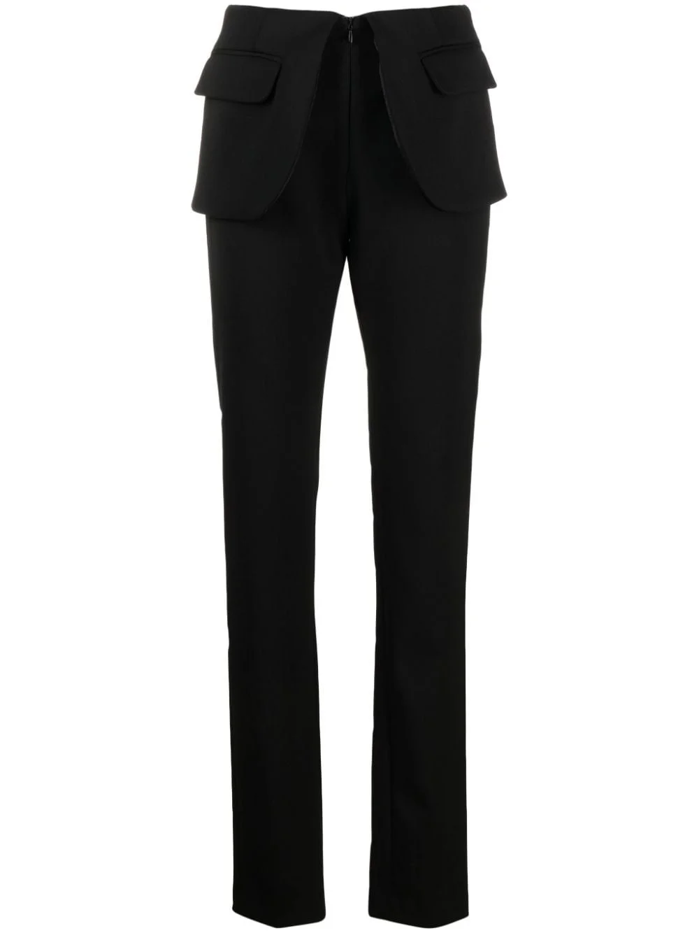 Flap tailored trousers Coperni displays its affinity for hybrid designs with these black trousers. They're cut to a slim-fit silhouette and are fitted with a trompe l'oeil flap-style overlay at the waistband that resembles the hem of a blazer. Highlights - Black - Stretch-design - Blazer-style overlay at waist - Dart detailing - Front zip fastening - Two front flap pockets - Tailored cut Imported Composition Recycled Polyester 49%, Viscose 34%, Polyester 15%, Elastane 2% SIZE & FIT Model measurements Height 5 ft 11 in(1.8 m) Bust/Chest 32.67 in(83 cm) Hips 36.22 in(92 cm) Waist 24.4 in(62 cm) Measurement FRONT RISE 9.84 in(25 cm) HIPS 33.85 in(86 cm) WAIST 25.98 in(66 cm) FittingInformation Designed for a slim fit, these trousers offer a close fit at the waist, allowing a comfortable close fit and some movement over the leg Made from a midweight stretch fabric, this piece offers elasticity and flexibility when worn This piece fits true to size – take your usual size Washing instructions Dry Clean Only
