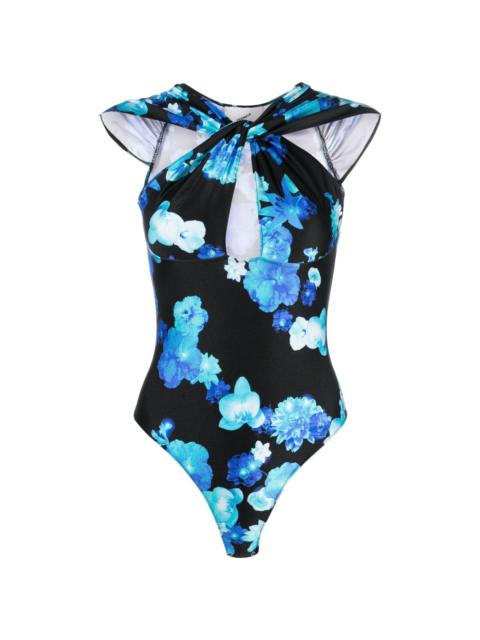 floral-print cut-out bodysuit Highlights - Black/blue - Stretch-jersey - All-over floral print - Cut-out detailing - Knot detailing - Keyhole neck - Sleeveless - Just a reminder that this piece must be tried on over your own garments. Imported Composition Polyamide 80%, Elastane 20% SIZE & FIT Model measurements Height 5 ft 10 in(1.79 m) Bust/Chest 33.07 in(84 cm) Hips 35.82 in(91 cm) Waist 24.01 in(61 cm) FittingInformation Designed for a close fit throughout Made from a midweight stretch fabric, this piece offers elasticity and flexibility when worn This piece fits true to size – take your usual size Washing instructions Machine Wash