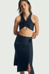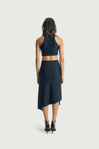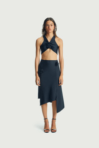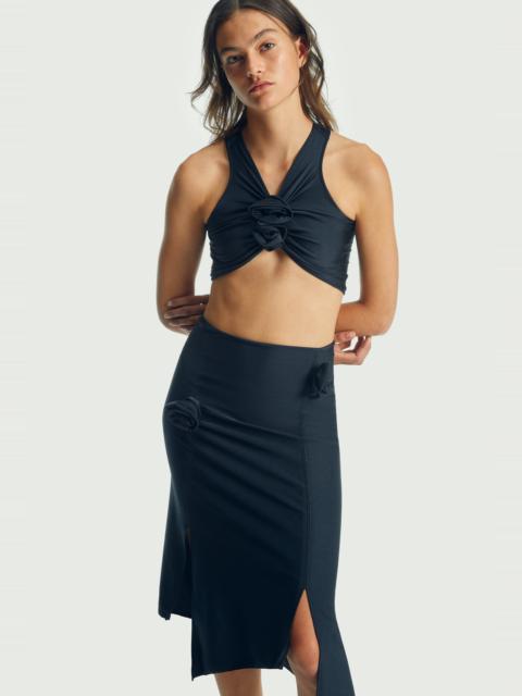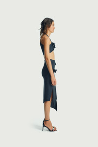 Combining long and short panels, this stretch black skirt has a sleek profile and a figure-skimming fit. Crafted to sit high on the waist, it features fabric knots in the shape of flowers and a deep slit up one leg, allowing the fabric to flow freely and fluidly as you move. Details Black 80% Polyamide 20% Elastane COPJS30545 Made in France Size and Fit True to size. Model is 177 cm / 5'8 ft and is wearing size S