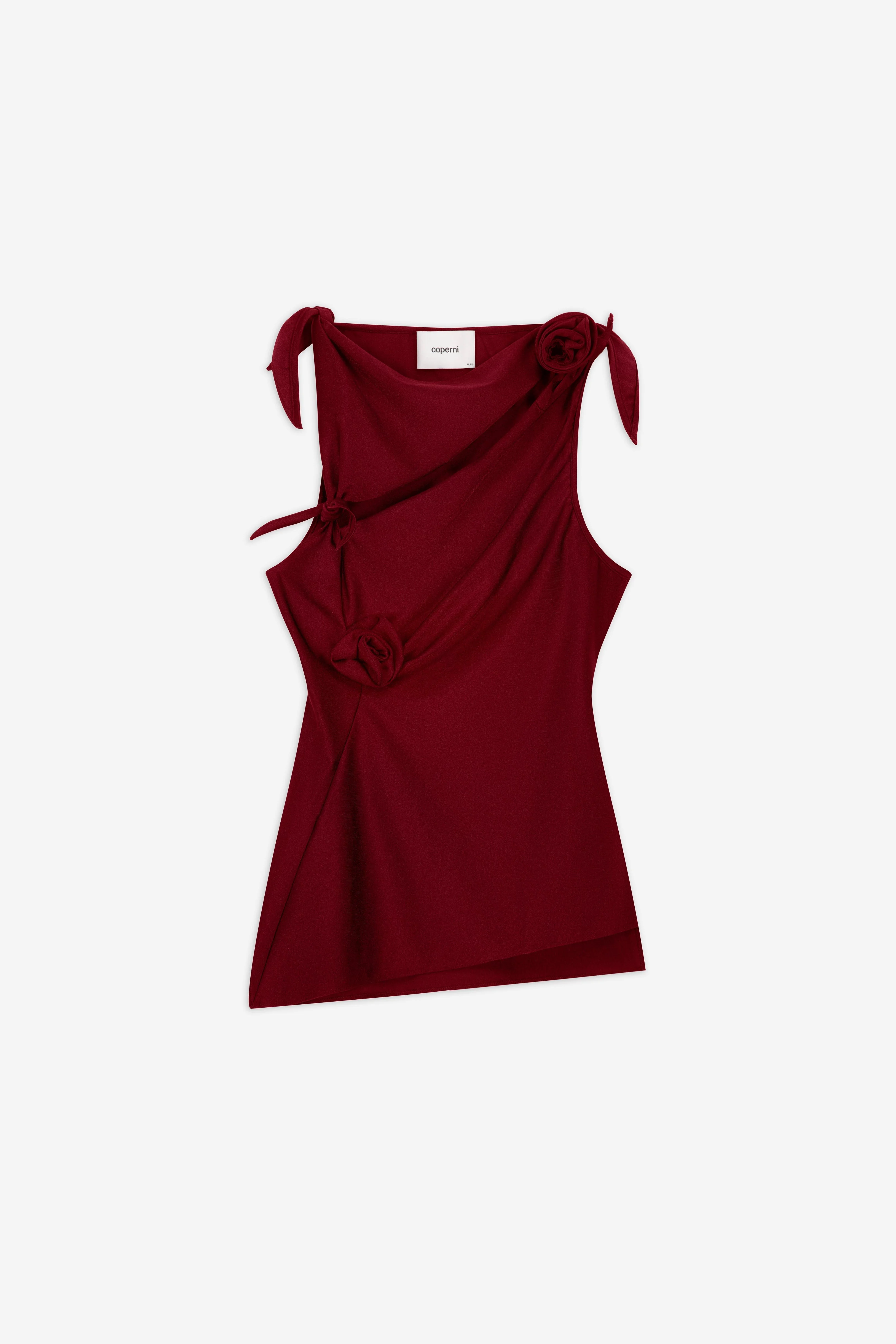 Crafted from technical stretch fabric in rich rhubarb red, this top plays with tension and release. Fabric is knotted and tied in asymmetrical gestures, revealing the skin across the shoulder and chest. Like a petal caught mid-twist, it combines structure and spontaneity in a single silhouette. DETAILS - Composition: Polyamide - Made in: France - Sku: COPT76545