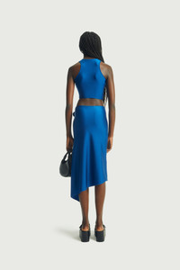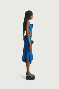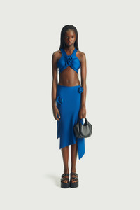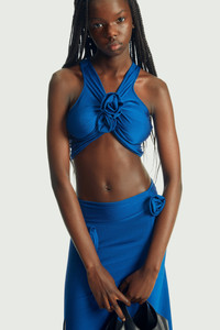 Stretch blue satin top gathered beneath the collarbone for a close-fitting, super cropped style. The central point is embellished with two knots in the form of roses. Come with matching pencil skirt . Details Blue 80% Polyamide 20% Elastane Made in France Size and Fit True to size. Model is 180 cm / 5'11 ft and is wearing size S