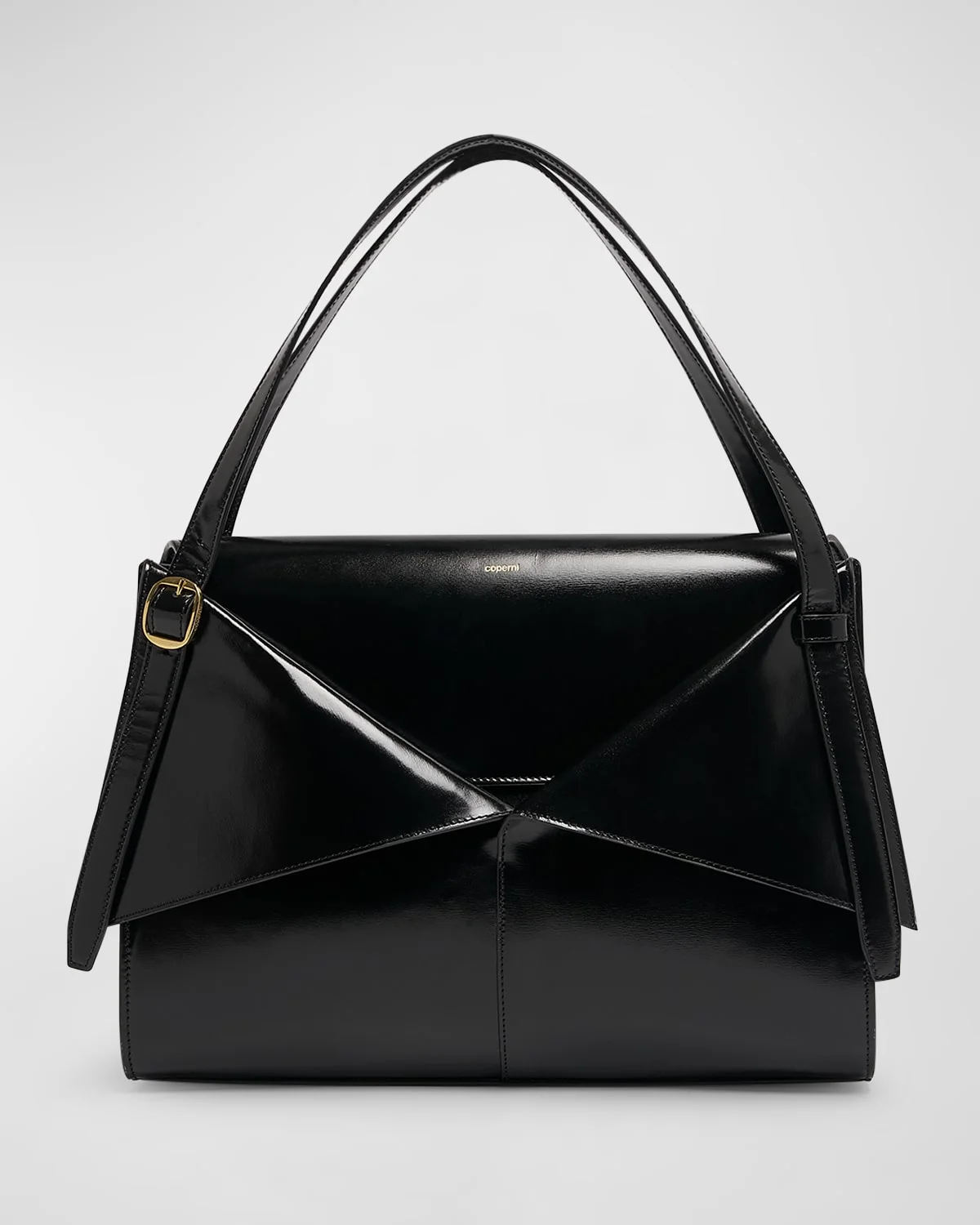 - Coperni "Rigid" shoulder bag in glossy leather - Belt shoulder straps, 7.1" drop - Open top with magnetic closure - Exterior, one slip pocket - Interior, one slip pocket - Lining: Cotton - Feet protect bottom of bag - Approx. 10.2"H x 13.8"W x 4.9"D - Spot clean - Made in Italy