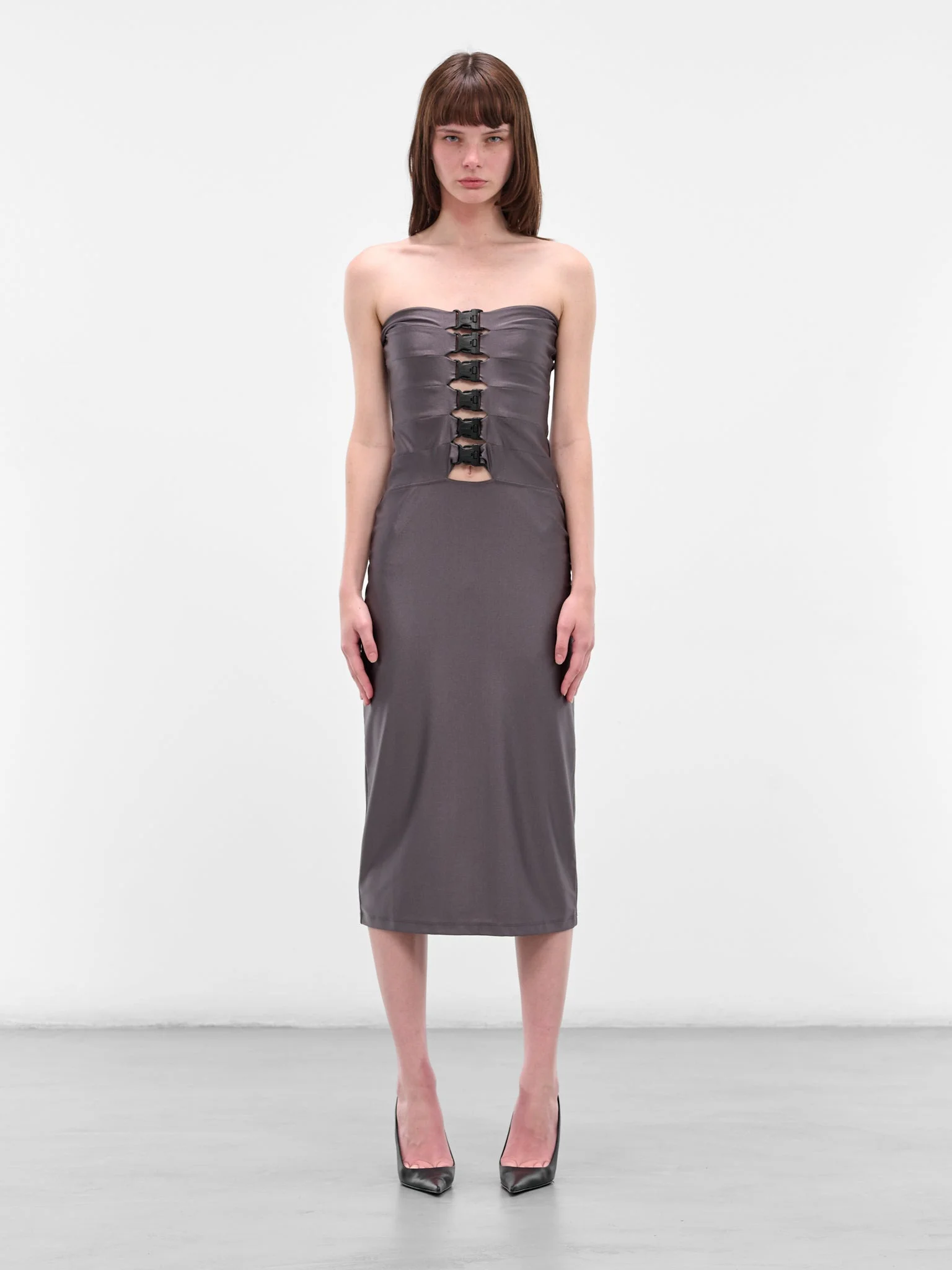 The Gray Multi Buckle Dress makes a sculptural statement with a strapless, second-skin fit defined by cut-out details and a linear row of matte black buckles down the front. The technical fabric creates a slick, body-conscious finish. Featuring: • Slim fit • Smooth technical fabric • Strapless, cut-out silhouette • Matte black buckle and strap detailing at front • Midi-length • Made in Portugal • 80% Polyamide 20% Elastane • Standard sizing Model is 5'7" wearing size S. Bust: 30" Waist: 22" Hips: 33"