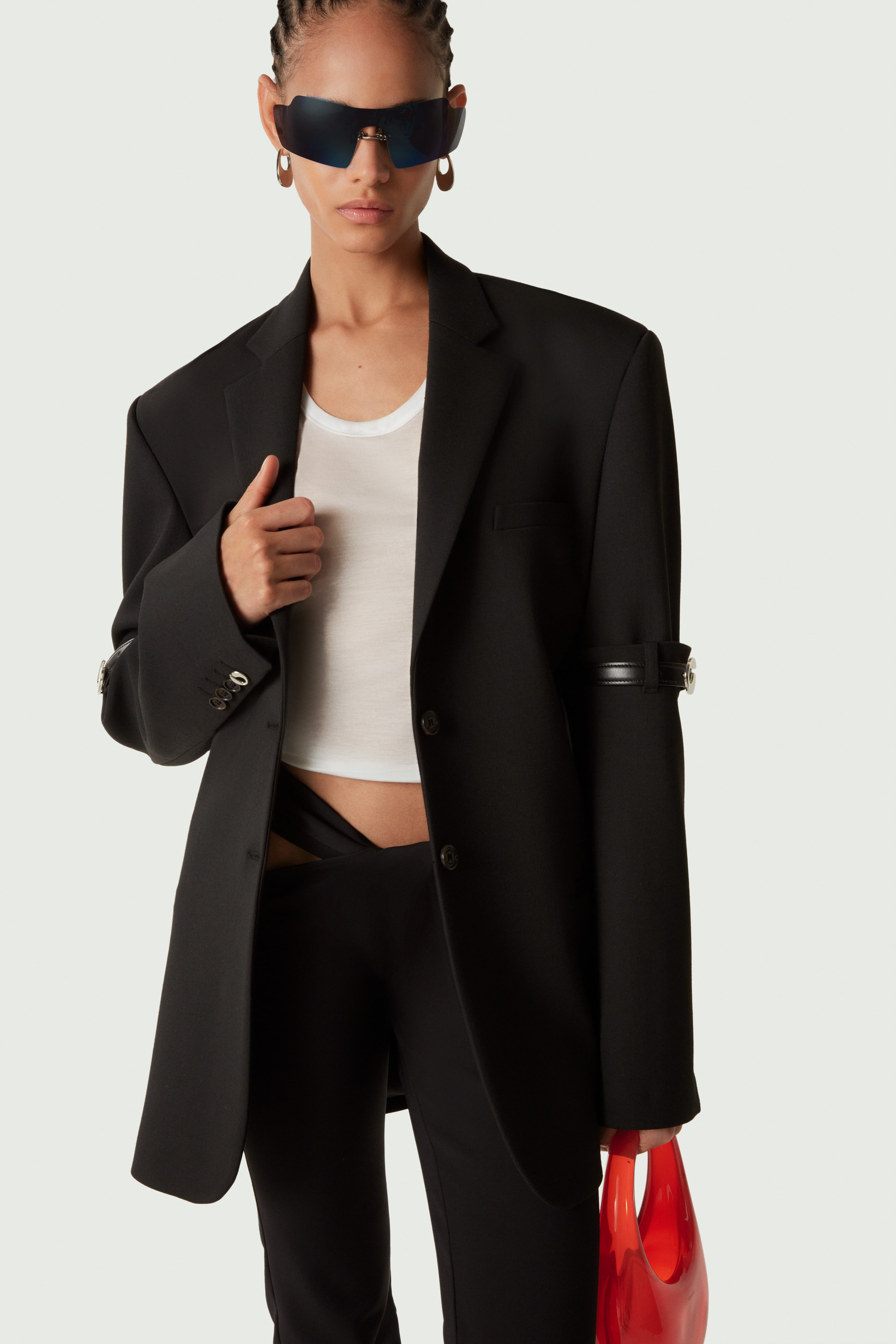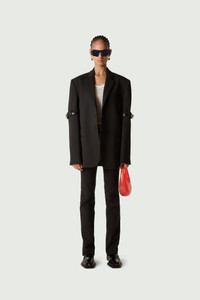 Loose fitting black blazer with belted sleeves. A twist on classic tailoring, the black Hybrid Jacket has an oversize single-breasted silhouette and reconfigured sleeves. Each one is split in half just above the elbow and secured with a brown slimline leather belt. Details Black COPV37111 Poly Viscose Made in Portugal Size and Fit Model is 177 cm / 5.8 ft and wears size FR36
