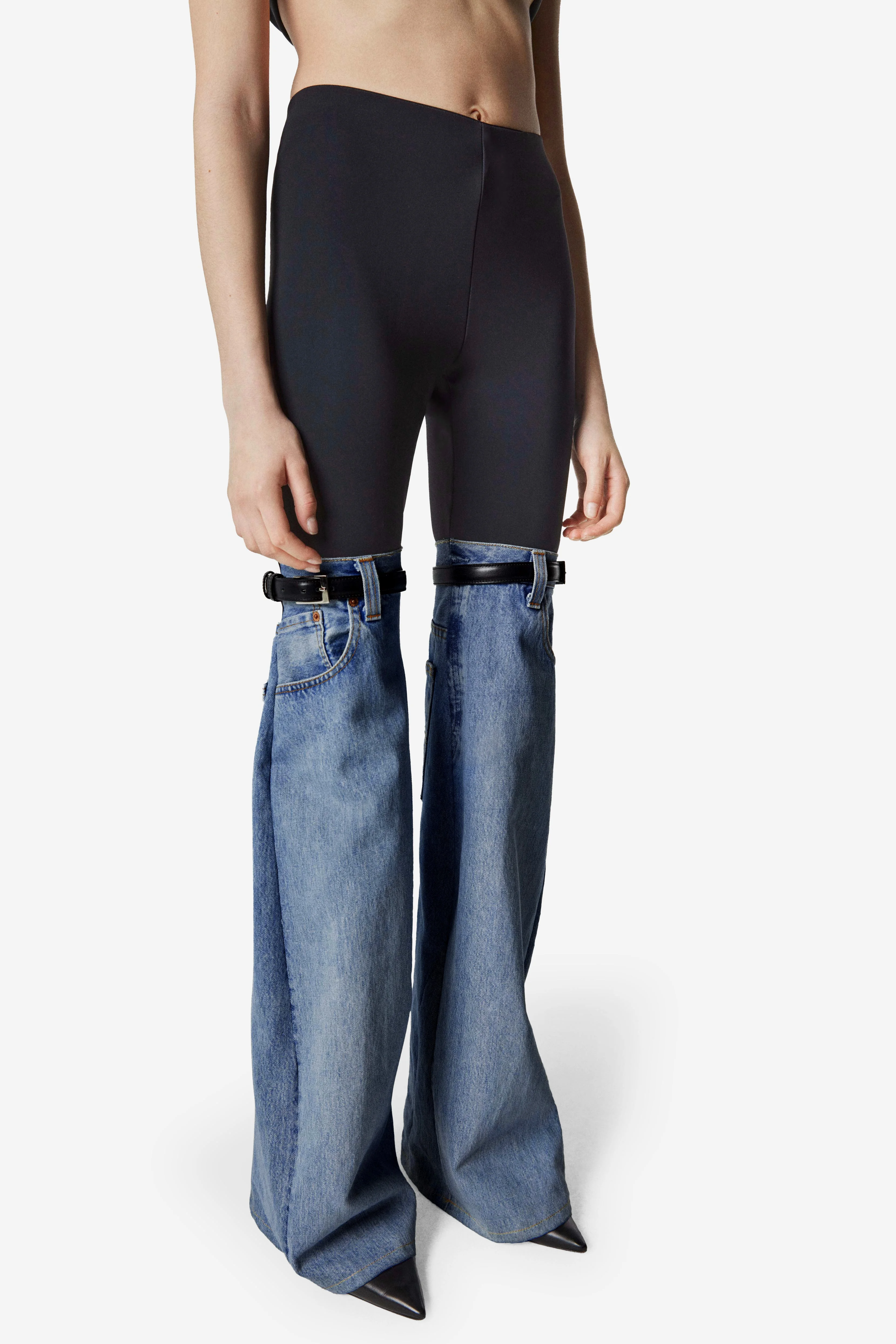 Inventive, daring and playful, these trousers are at once fusionist and futuristic. They feature stretch black jersey at the top for a smooth fit around the hips and thighs, and fall into a looser silhouette from the knees down thanks to a lower section cut from washed blue denim that pools around the ankles. Above each knee, a slim buckled belt completes this unique combination of textures and volumes. Details - Made in: Italy - Sku: COPP24252 Size and fit Model is 176 cm / 5.7 ft and wears size FR36.