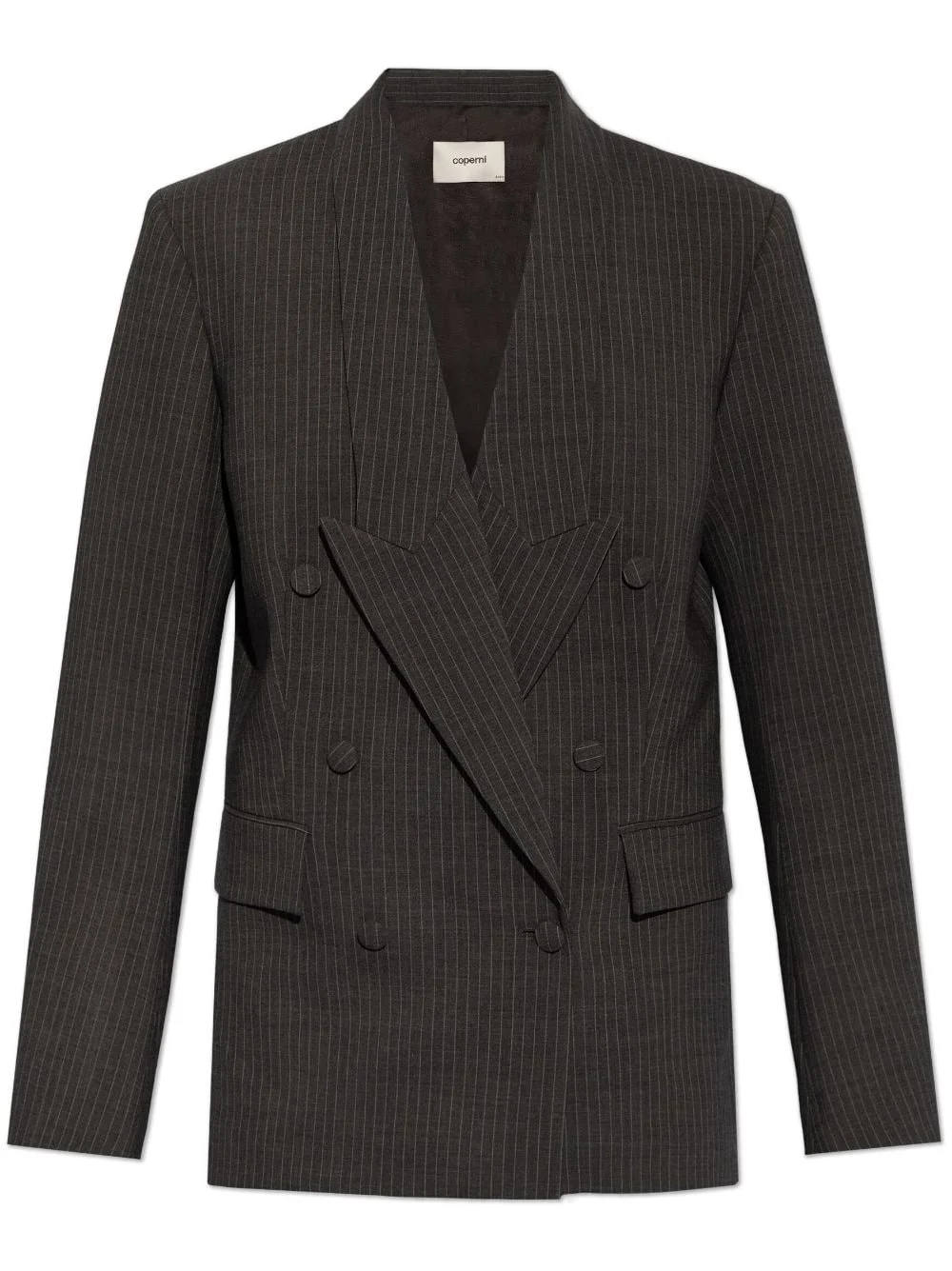pinstripe double-breasted blazer Highlights - Dark grey - Virgin wool blend - Tailored design - Pinstripe pattern - Peak lapels - Shoulder pads - Long sleeves - Buttoned cuffs - Two side flap pockets - Full lining - Double-breasted button fastening Made in France Composition Outer: Virgin Wool 96%, Spandex/Elastane 4% Lining: Cotton 100%