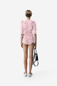 Inspired by a lingerie style, these high cut shorts are crafted from gauzy pink fabric with a subtle shimmer. Hand-sewn butterfly-shaped appliques endow the material with a sense of movement as they gently flutter as you move. Details Pink COPML138Y3015 100% Polyester Made in Italy