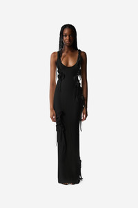 This pull-on dress is designed to hug the silhouette and is crafted from stretch knit fabric with thick ribbing for a richly textured result. The material is intricately engineered with swirling flower-like knots for a flattering ruching effect. Loose fabric ties lend a deconstructed and 'shredded' look to this garment and gently dance around your shape as you move like tassels. Details Black COPML144Y3011 90% Viscose 9% Polyester 1% Elastane Made in Italy