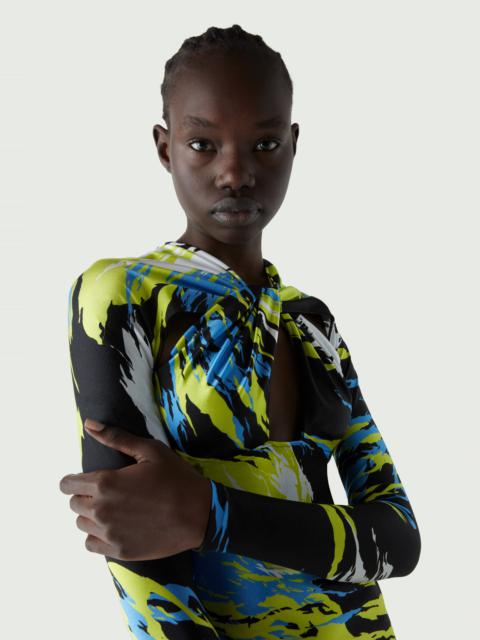 This black jersey dress fuses athletic minimalism with sculptural play. Designed with a body-hugging tank top upper, it features a dramatic front slit and a knotted drape at the hip, mimicking the nonchalance of a sweatshirt tied around the waist. The assymetric hemline adds movement while a folded label detail at the back nods to deconstructed streetwear. A subversive take on casual codes. Details Black COPJS160F5009 Cotton-Modal Made in Portugal