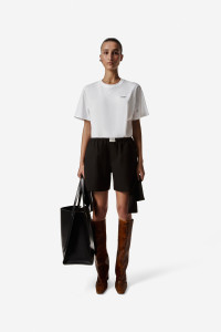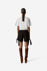Inspired by men's boxer shorts for a relaxed day-to-night style, these pull-on shorts feature an elasticated waist and thick side bands at the hemline that can be loosely looped together or knotted for a louche ribbon effect. Crafted from pure black wool, they can be worn high or low on the waist as you please. At the front, they feature a Coperni logo patch with a vintage-style graphic design. Details Black 100% Polyester Made In Bulgaria COPP96F3004 Size and Fit Model is 174 cm / 5.7 ft and wears size FR34