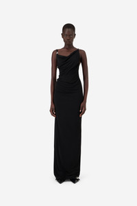 Crafted from fluid jersey, this floor-length dress clings and flows with effortless elegance. A softly draped cowl neckline meets two sculptural straps - one slim, one bold - connected by metallic logo clasps. The open back reveals an unexpected twist. Minimal, sensual, and quietly dramatic, this silhouette evokes movement even in stillness. DETAILS - Composition: Polyester - Made in: Italy - Sku: COPR205F5022