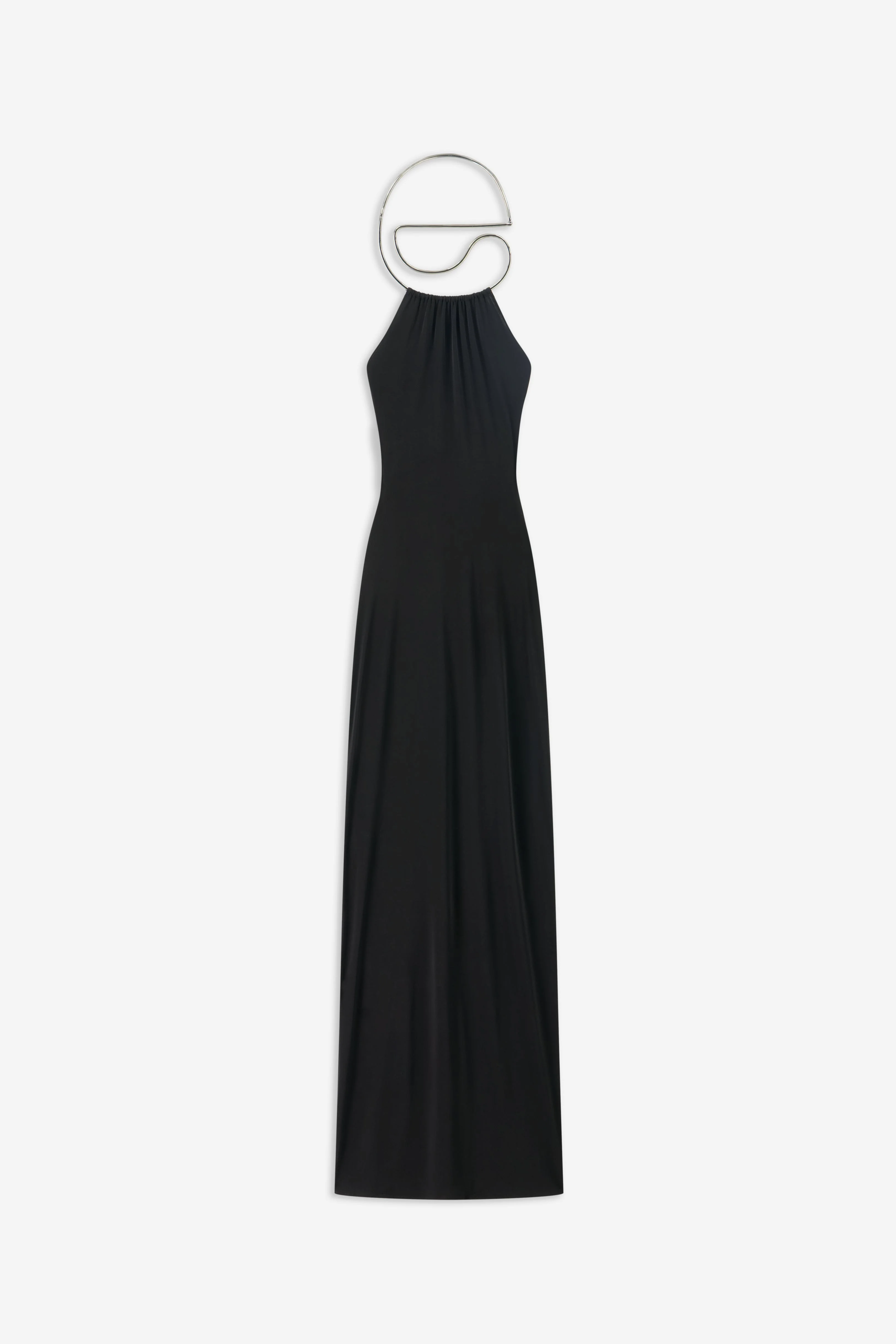 The essence of minimal design, this Logo Necklace Dress redefines nighttime dressing through Coperni's futuristic lens. Made from soft and flowy fabric, the long column silhouette drapes the frame, while a halter neckline gathers at a built-in mettalic collar, formed in a brand's signature logo. The bare back enhances the elegance. DETAILS - Composition: Polyester - Made in: France - Sku: COPR207F5022
