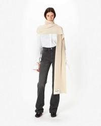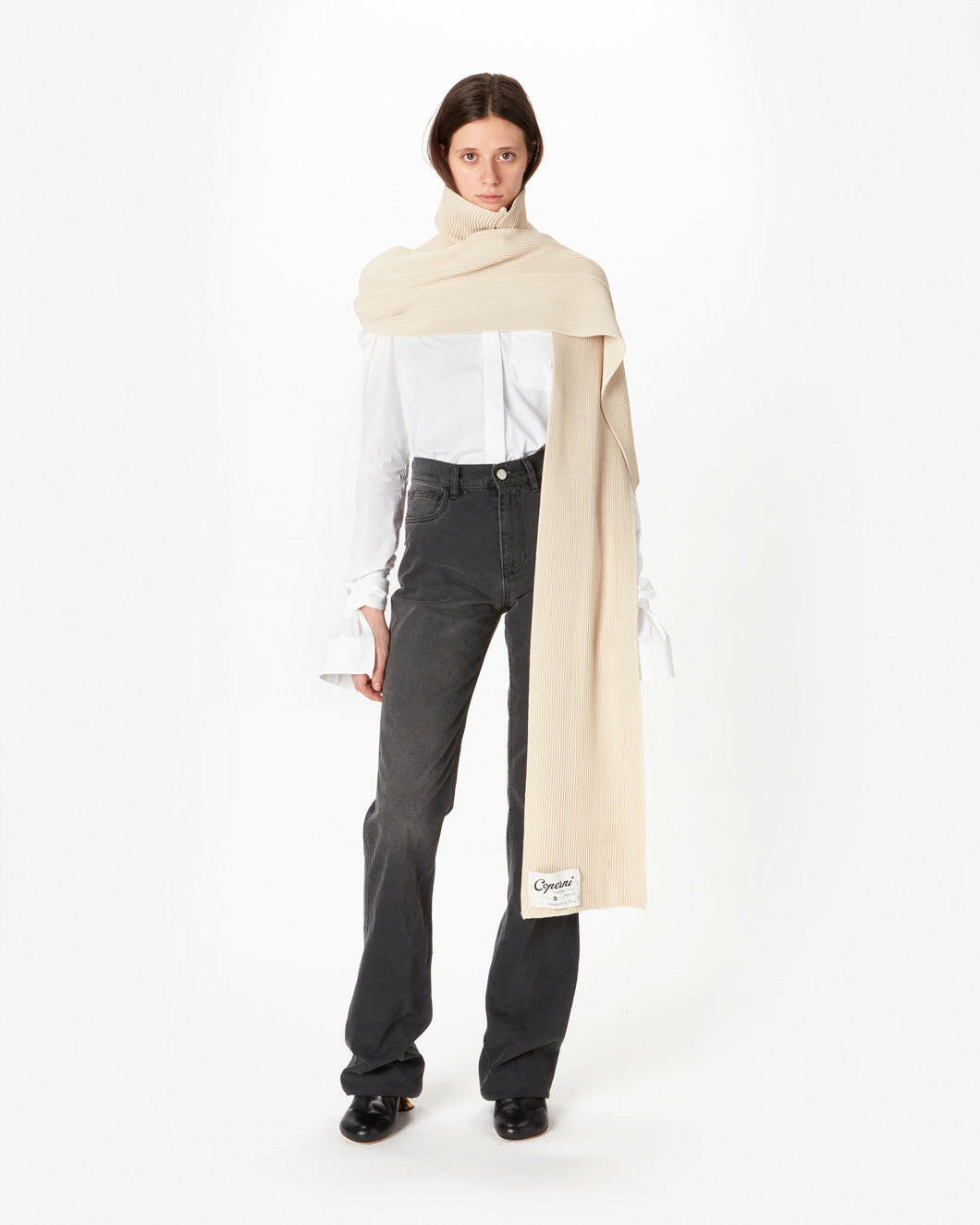 The Knitted Collar Scarf in Beige by Coperni is a mid weight scarf featuring a knitted turtleneck collar detail and logo patch crafted in a stretch fabrication. - 65% Viscose, 35% Polyamide - Made in Italy - # - COPSA01Y3003