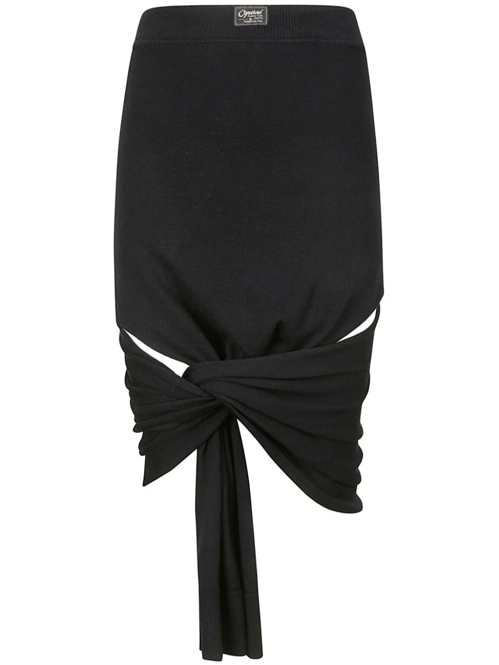 logo-patch wool midi skirt Highlights - Navy blue - Wool - Logo patch to the front - Elasticated waistband - Ribbed waistband - Knot detailing - Draped detailing - Asymmetric hem Imported Composition Wool 100%