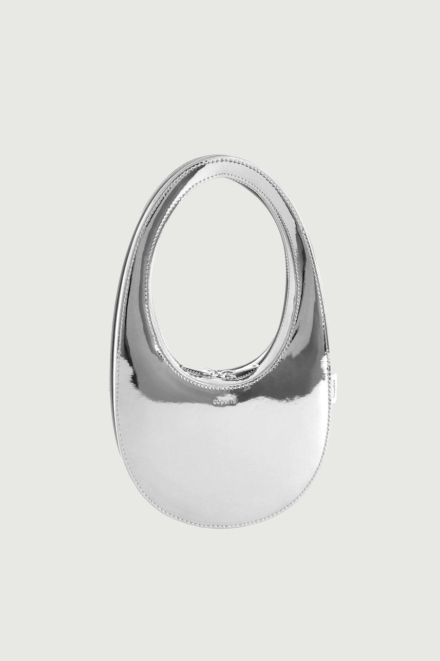 Contemporary oval-shaped bag crafted from metallic faux leather and featuring a circular double-ended zip. With its practical size and lightweight feel, the Coperni signature Swipe Bag, seen here in shiny silver faux leather, tucks neatly under the arm and takes you seamlessly from day to night. The bag features a shielded circular double-ended zip. The Swipe Bag is inspired by the 'swipe to unlock' icon of an iPhone. Details Silver COPBA01452 Synthetic Made in Italy Size and Fit Height 38cm /14.9in Width 22cm /8.6in Depth 5.5cm/2.2in