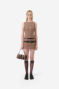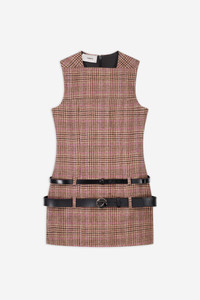 Designed in a brown check wool, the dress features a clean, sleeveless silhouette with a sharp square neckline. Black belts wrap the waist and hips for a cinched effect, each adorned with a signature hardware logo. A micro hemline adds boldness, while the structured construction ensures a confident and modern uniform. DETAILS - Composition: Wool - Made in: Bulgaria - Sku: COPR214F1012
