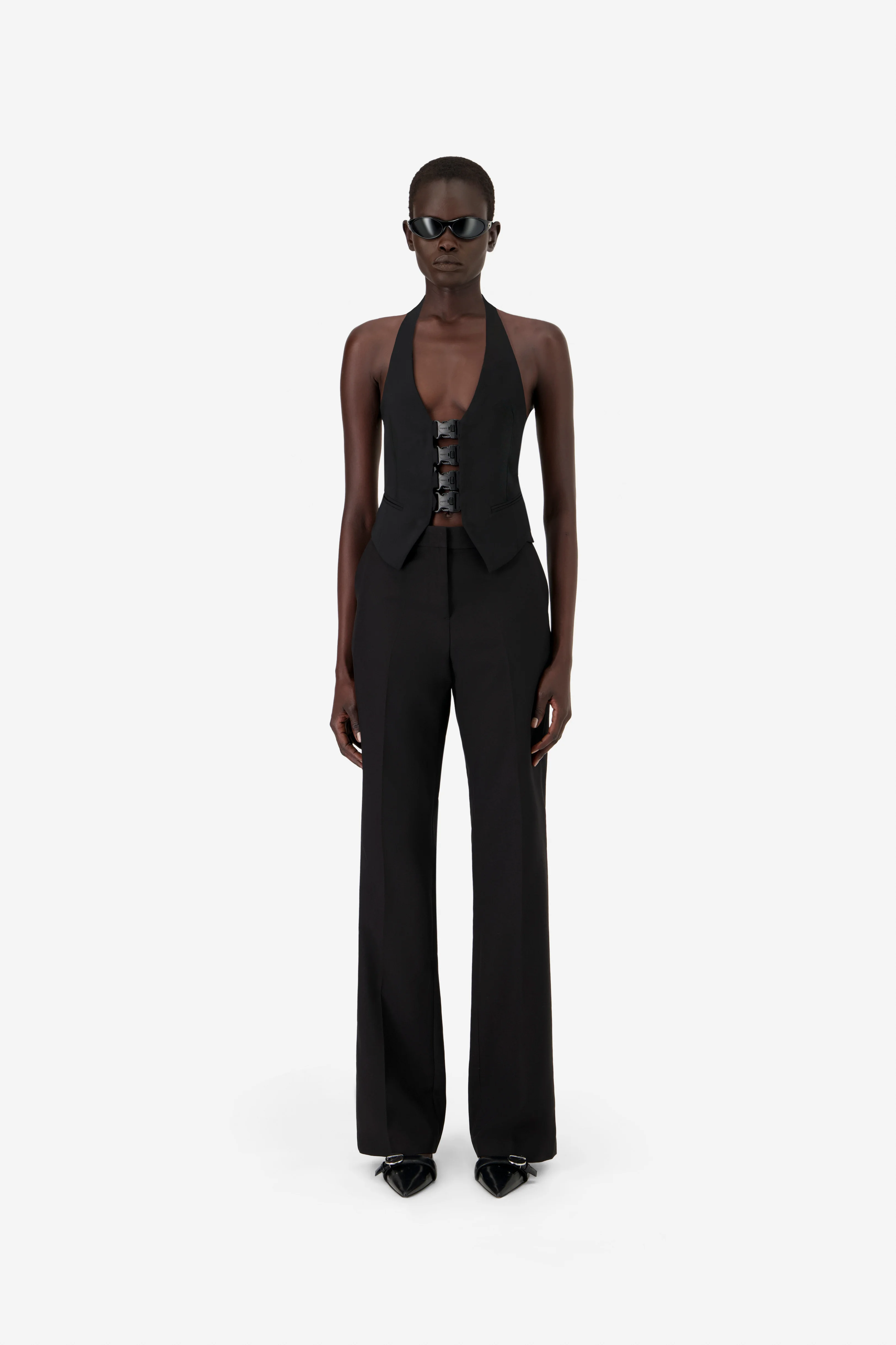 Coperni's modern lens update the classics. The sleek black waistcoat offers a clean tailoring to move with ease. Five tonal straps with matte black buckles run below the plunged neckline, that adds edge and enhance the fit. A simple nod to utility wear while keeping the look refined and fresh. DETAILS - Composition: Recycled Polyester - Made in: Bulgaria - Sku: COPT35F3004