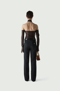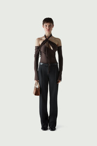 Brown stretch bodysuit with tassel strands. Seen on the Coperni AW23 runway, this stretch bodysuit has a futuristic look that's fluid and full of movement. With a twisted silhouette and a knotted asymmetrical neckline, it has a revealing shoulder line, flared cuffs and long ribbon strands that dance around the body as you move. Details Brown 80% Polyamide 20% Elastane COPJS68545 Made in Portugal Size and Fit True to size. Model is 175 cm / 5'7" ft and is wearing size S