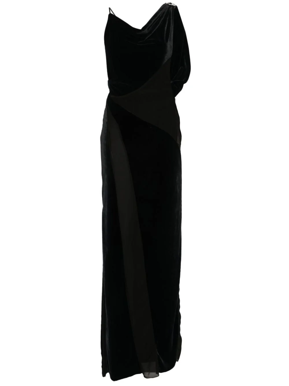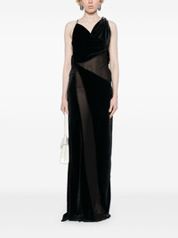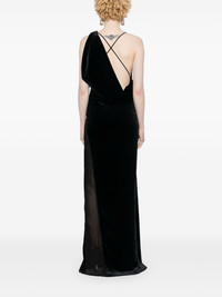 logo-plaque panelled maxi dress Highlights - Black - Faux-fur design - Semi-sheer panels - Panelled design - Silver-tone logo plaque - Cowl neck - Asymmetric neck - Open back - Side slit - Concealed side zip fastening - Long length - Straight hem - Unlined Made in France Composition Polyester 100% SIZE & FIT Model measurements Height 5 ft 9 in(1.75 m) Bust/Chest 34.64 in(88 cm) Hips 36.61 in(93 cm) Waist 26.37 in(67 cm) FittingInformation Designed for a close fit throughout Made from a midweight non-stretch fabric, this piece offers minimal elasticity when worn This piece fits true to size – take your usual size