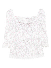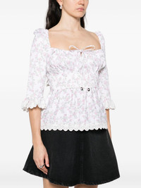 floral-print ruffled top Highlights - White - Floral print - Ruffled trim - Three-quarter sleeves - Lace-up fastening - Scalloped hem Imported Composition Viscose 55%, Linen/Flax 35%, Cotton 10% SIZE & FIT Model measurements Height 5 ft 9 in(1.75 m) Bust/Chest 32.67 in(83 cm) Hips 36.22 in(92 cm) Waist 24.8 in(63 cm) Washing instructions Dry Clean Only