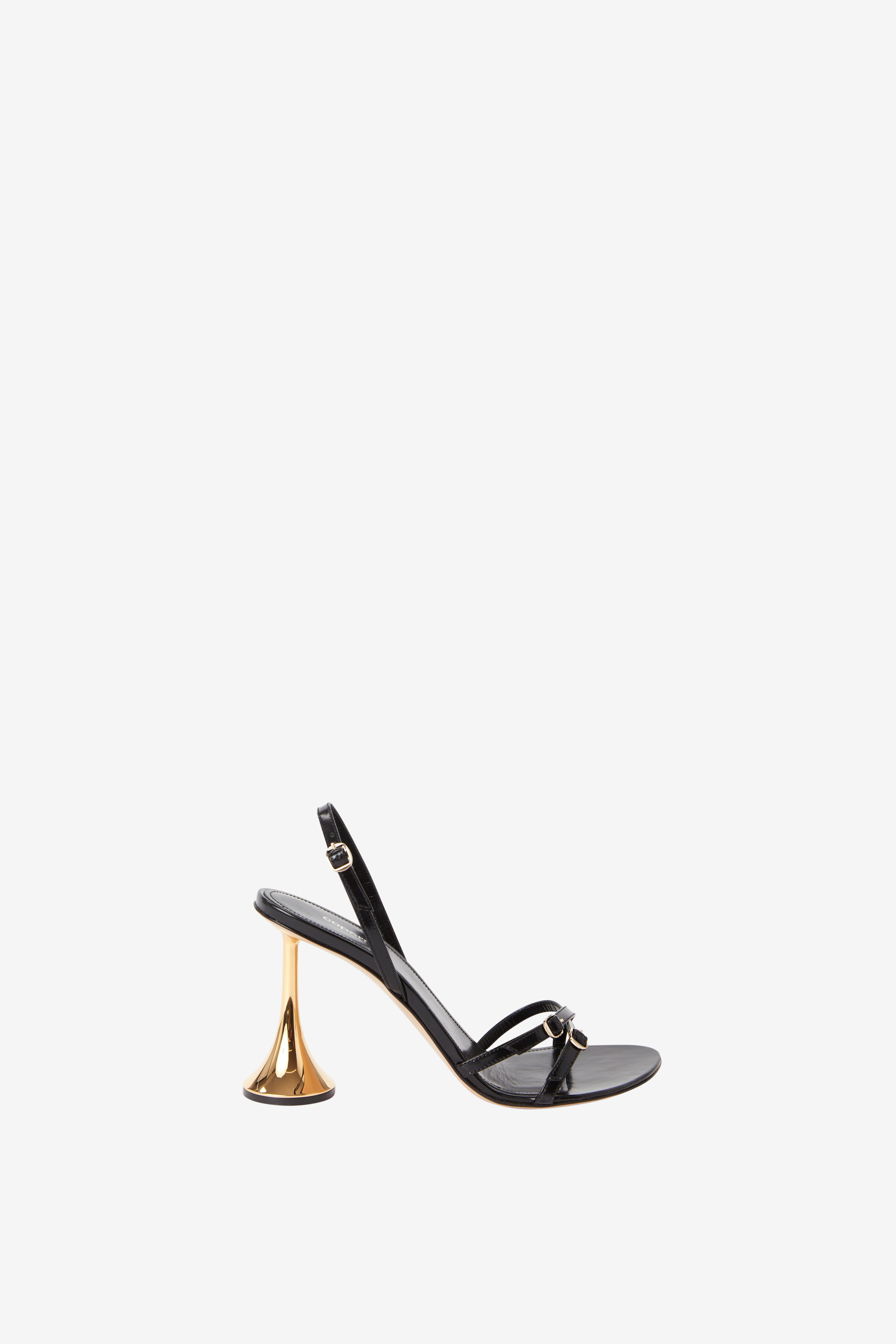 Coperni’s SS24 catwalk collection was inspired by classic instruments and contemporary sound technologies. These Orchestra sandals are so-named for their golden heels shaped like upside-down trumpets, lending their minimal silhouette an avant-garde edge. The sandals are crafted from smooth black leather and the two top straps are adorned with small silver buckles. Details Black Leather Made In Italy COPSH52496 Size and Fit Fits true to size.