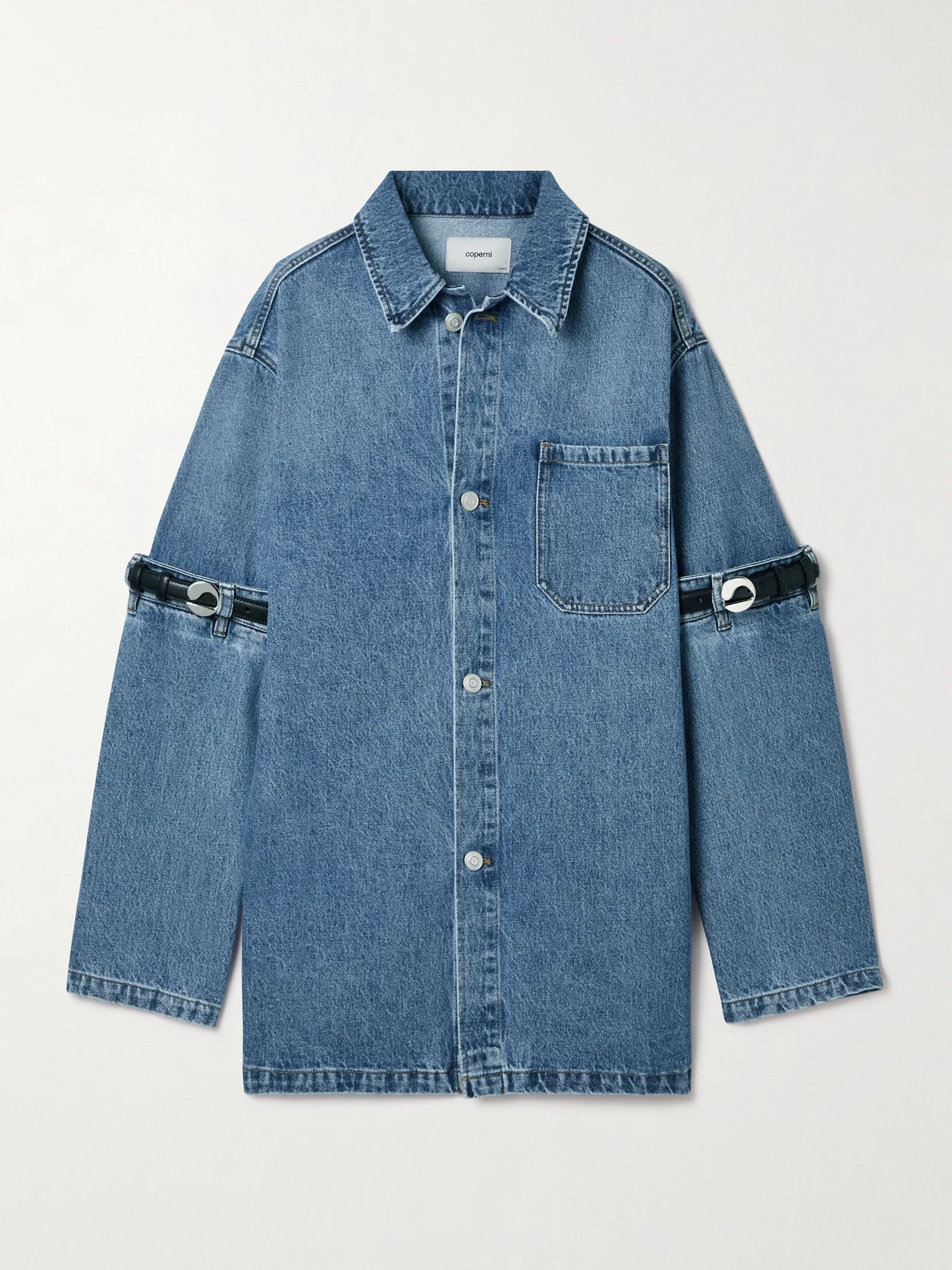 Coperni's jacket is designed with signature leather belts that are threaded through the sleeves. Cut in Italy from paneled denim in a classic blue shade, it has an oversized fit emphasized by dropped shoulders. Style yours with black leggings.