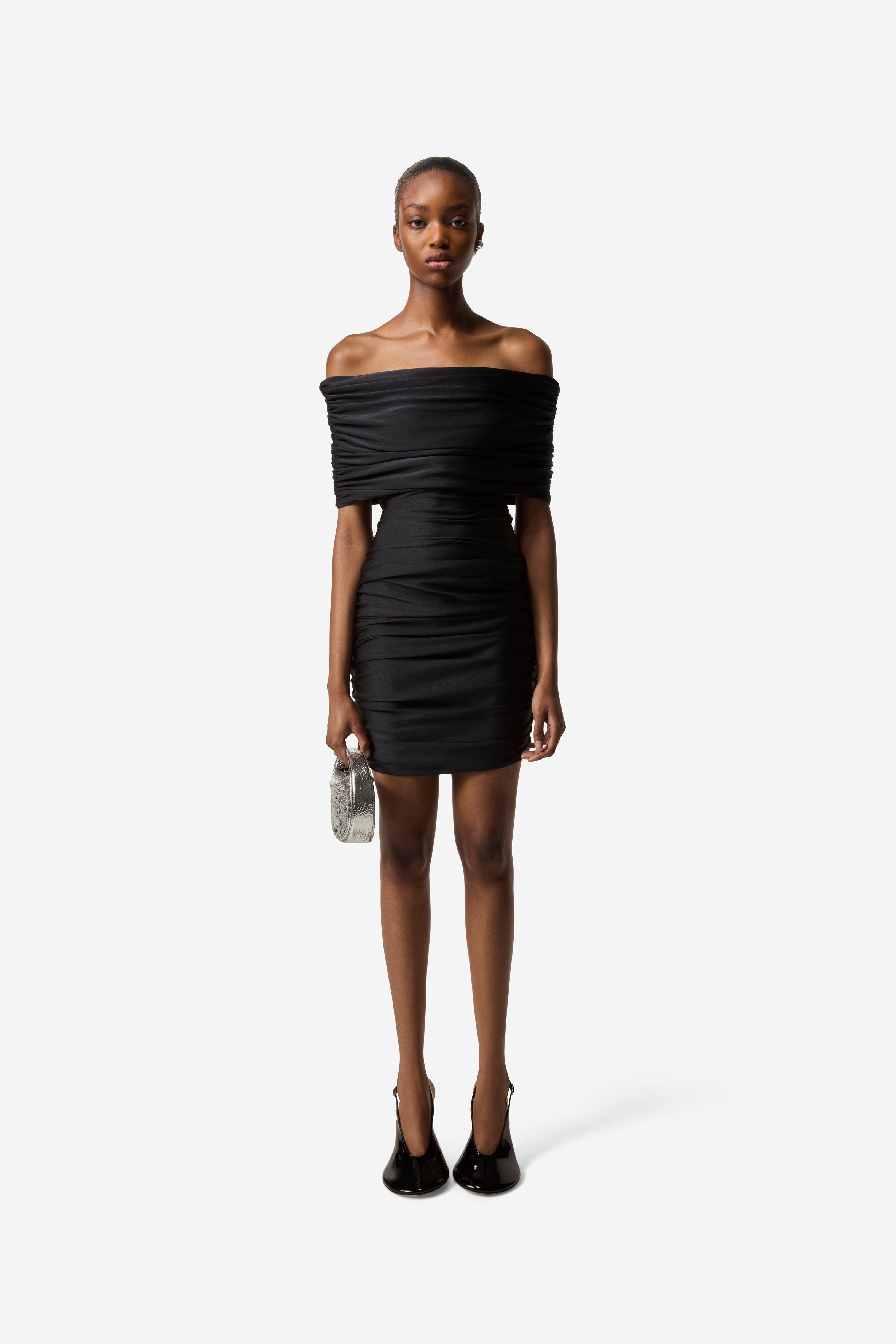 Highly textured and tactile, this figure-shaping little black dress is pleated throughout for a flattering ruched effect. It features a large bandeau-style front leaving the shoulders and neckline elegantly bare. Details Black COPR139545 80% Polyamide 20% Elastane Made in France Size and Fit Model is 178 cm / 5.10 ft and wears size S