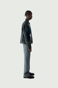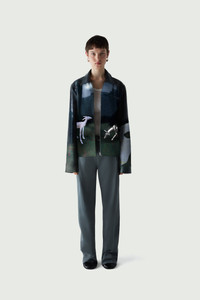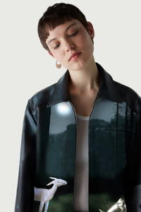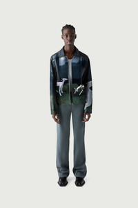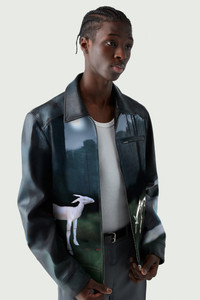 Faux leather jacket with an allegorical print. Coperni's Fall 2023 catwalk explored the idea of modern myth-making by combining folklorish imagery with robotics and AI. Inspired by the famous 17th century fable, The Wolf and the Lamb, written by Jean Lafontaine and illustrated by Gustave Doré, the designers reinterpreted the narrative through a machine-learning system. Here a seemingly classic and painterly print was generated by DALL-E software and digitally printed on to a faux-leather jacket, cut in a classic biker style with long knuckle-grazing sleeves and a zip-front. Details Midnight Faux Leather: 44% Polyester 28% Polyurethane 28% Viscose COPOW14702 Made in Italy Size and Fit True to size. Female model is 175 cm / 5'7" ft and is wearing size FR36 Male model is 185 cm / 6" ft and is wearing size FR36.
