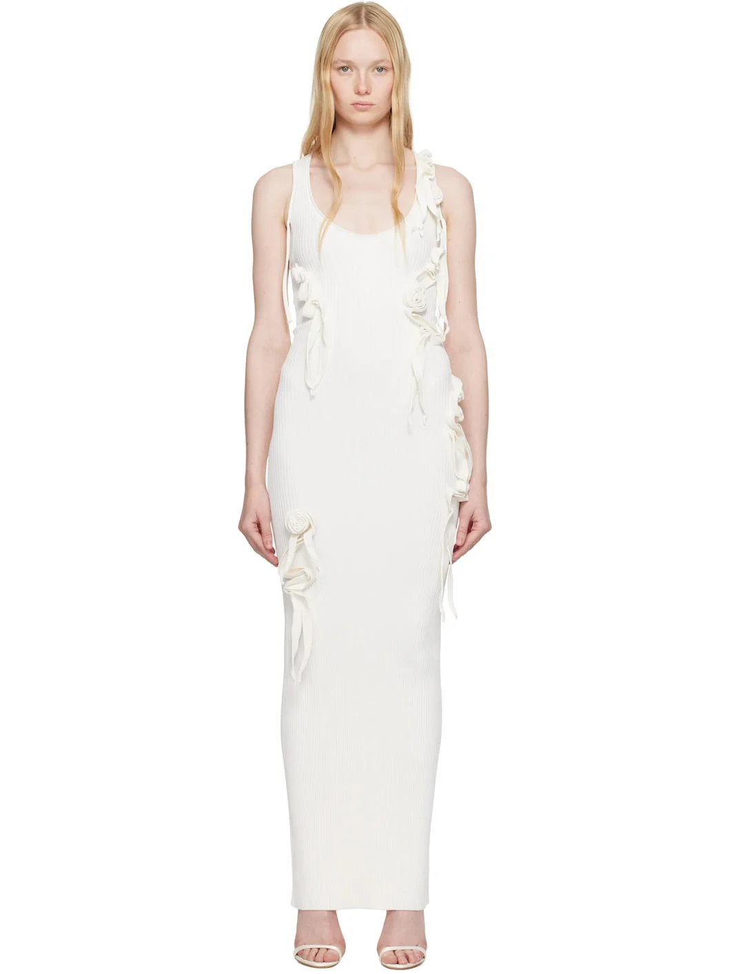 Stretch viscose-blend ribbed jersey maxi dress. Floral appliques throughout. · Rolled edge at scoop neck and armscyes · Logo embroidered at back collar Supplier color: White 90% viscose, 9% polyamide, 1% elastane. Made in Italy 251325F055011