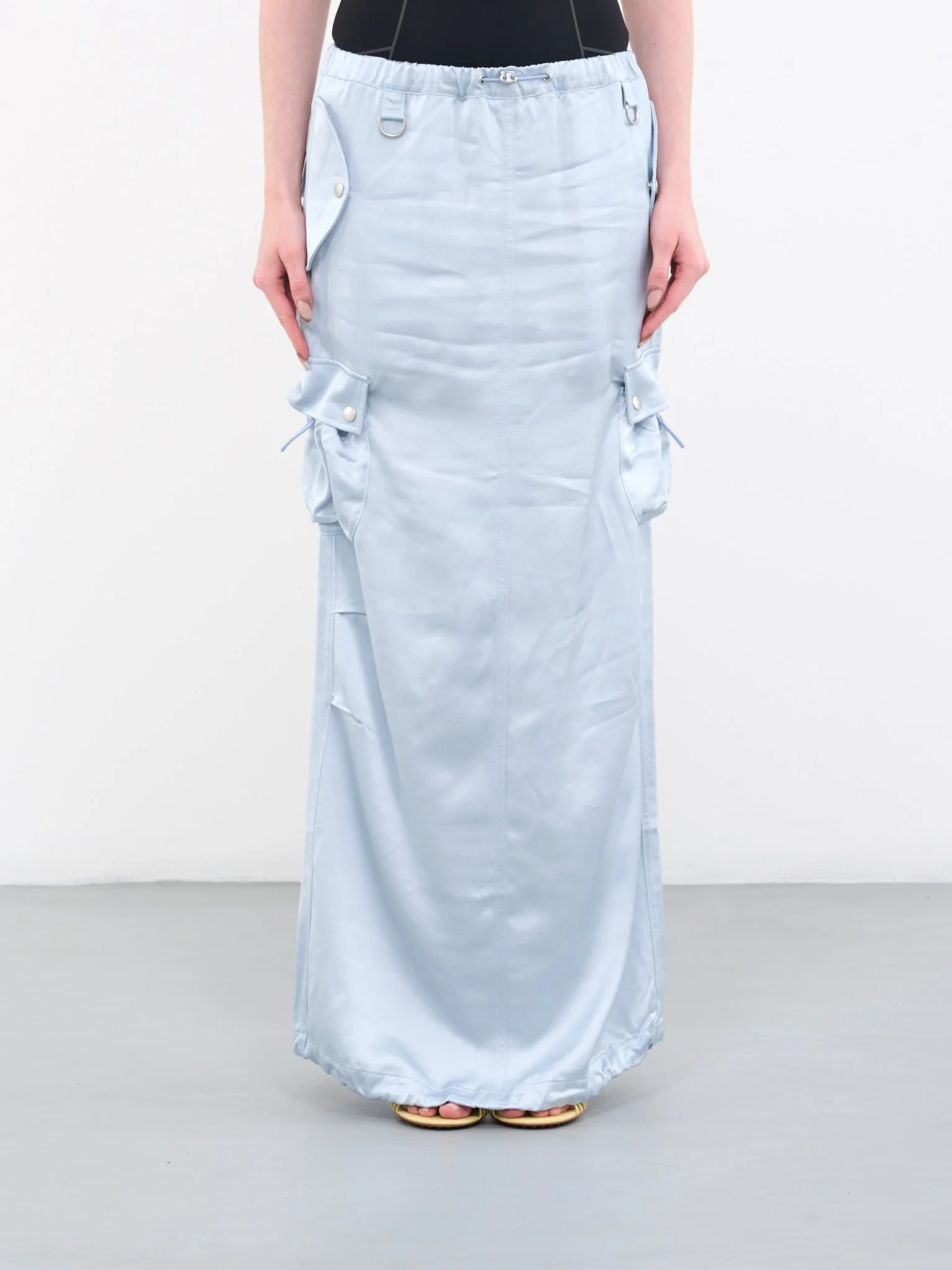 COPERNI skirt in blue, cargo design, satin fabric, mid-elastic waist, bungee cord fastening, d-ring details, five cargo pockets, woven logo label, back slit, maxi length, regular fit. Made in Portugal Italian Sizing Model is 5'7.5" wearing size 36. Bust: 32" Waist: 24" Hips: 34"