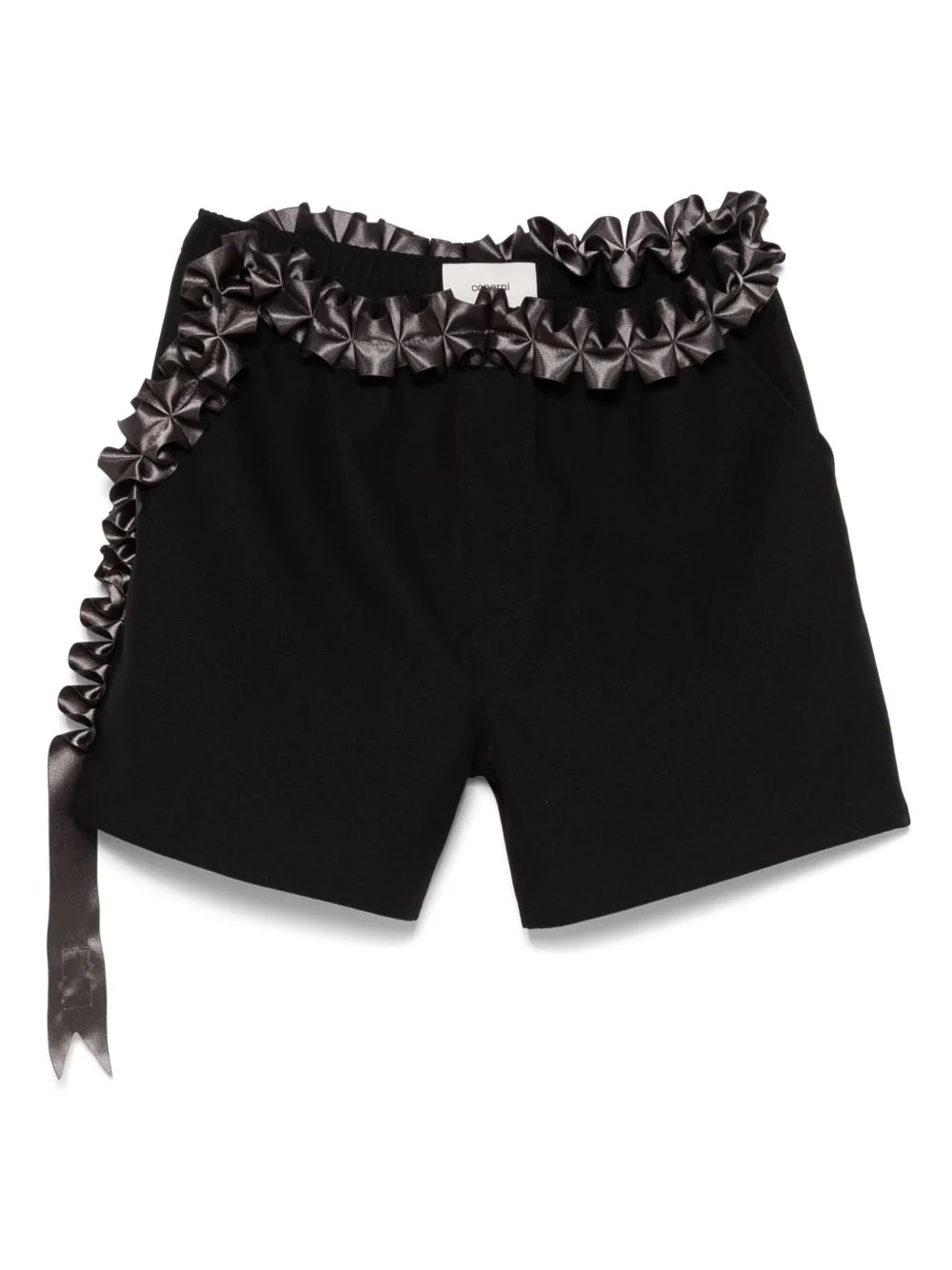 tailored shorts Highlights - Black - Elasticated waistband - Two diagonal pockets to the sides - Ruffled trim Imported Composition Recycled Polyester 100% SIZE & FIT Model measurements Height 5 ft 10 in(1.78 m) Bust/Chest 33.46 in(85 cm) Hips 36.22 in(92 cm) Waist 23.22 in(59 cm) FittingInformation Designed for a loose fit, offering comfort and movement when worn The elasticated waist allows for a comfortable fit Made from a midweight non-stretch fabric
