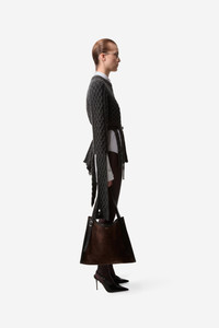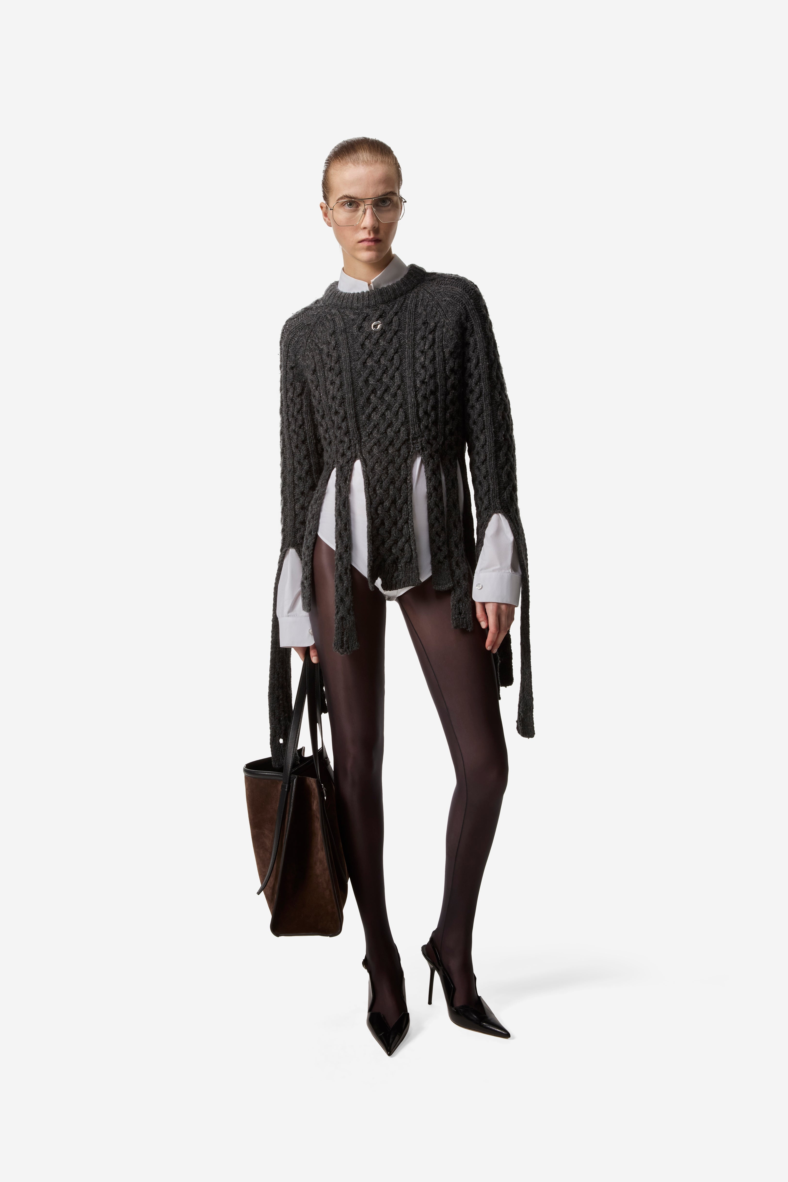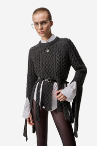 Knitted from pure grey wool in a classic cable pattern, this sweater has a shredded look that starts just above the waist and through the sleeves with deep slits rising to the elbows. Like thick fringing cut with at various thicknesses, these fluid pieces sway gracefully as you move. Details Grey COPML123Y3008 80% Wool 20% Polyamide Made in Size and Fit Model is 176 cm and wears size S