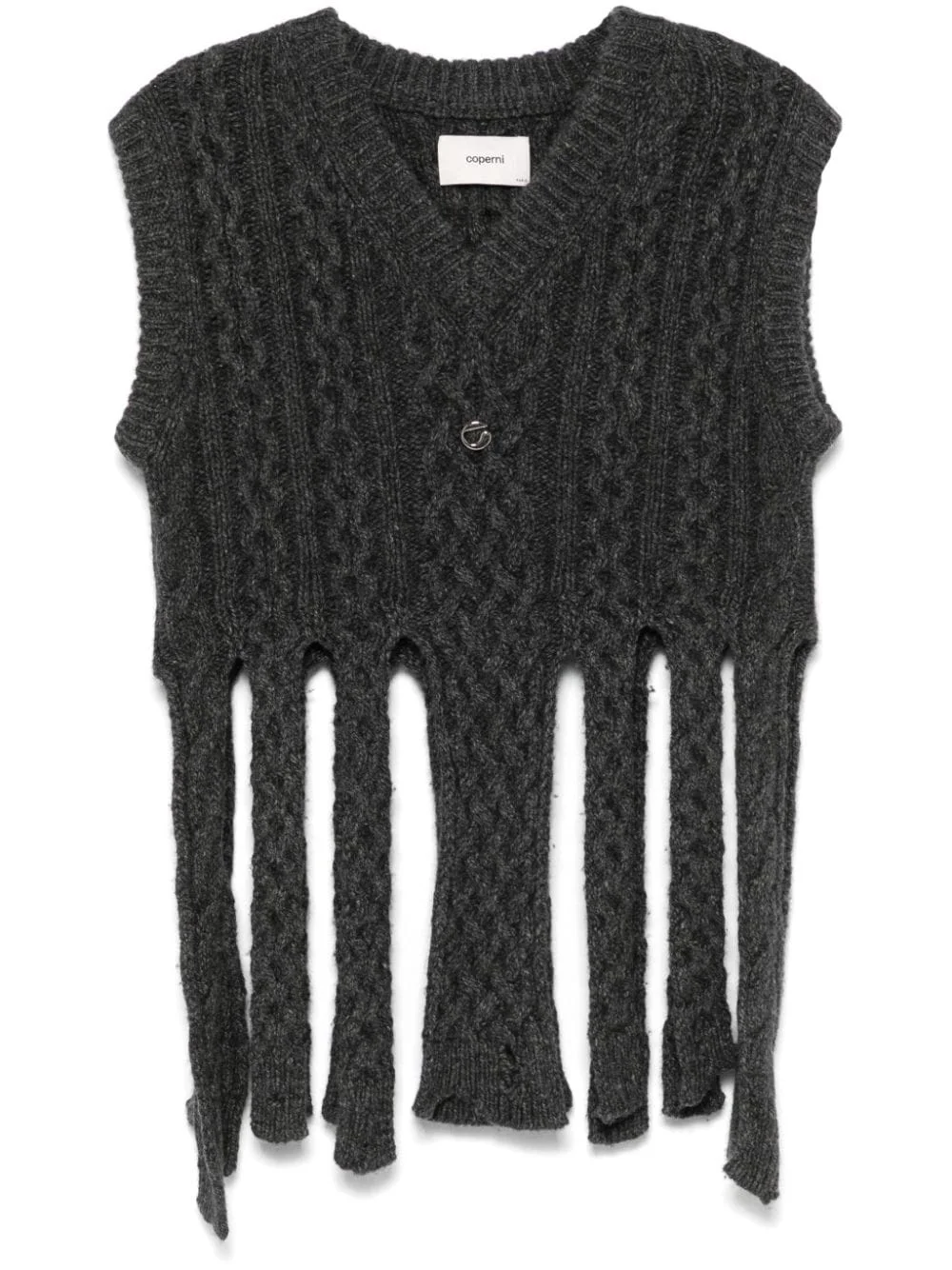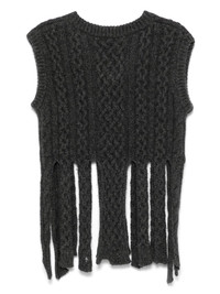 shredded vest Highlights - Anthracite grey - Chunky cable knit - Distressed finish - V-neck - Sleeveless - Ribbed cuffs - Logo plaque - Fringed edge Imported Composition Lambs Wool 80%, Polyamide 20%