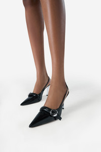 This sleek and sharp pair of slingbacks feature pencil-thin stiletto heels and delicate straps that sit high and comfortably behind each ankle. They have elegant, pointed tips and belt-like straps, each embellished with a statement silver-toned Coperni logo. Details Black COPSH82F6052 100% Cow Leather Made in Spain Size and Fit True to size.