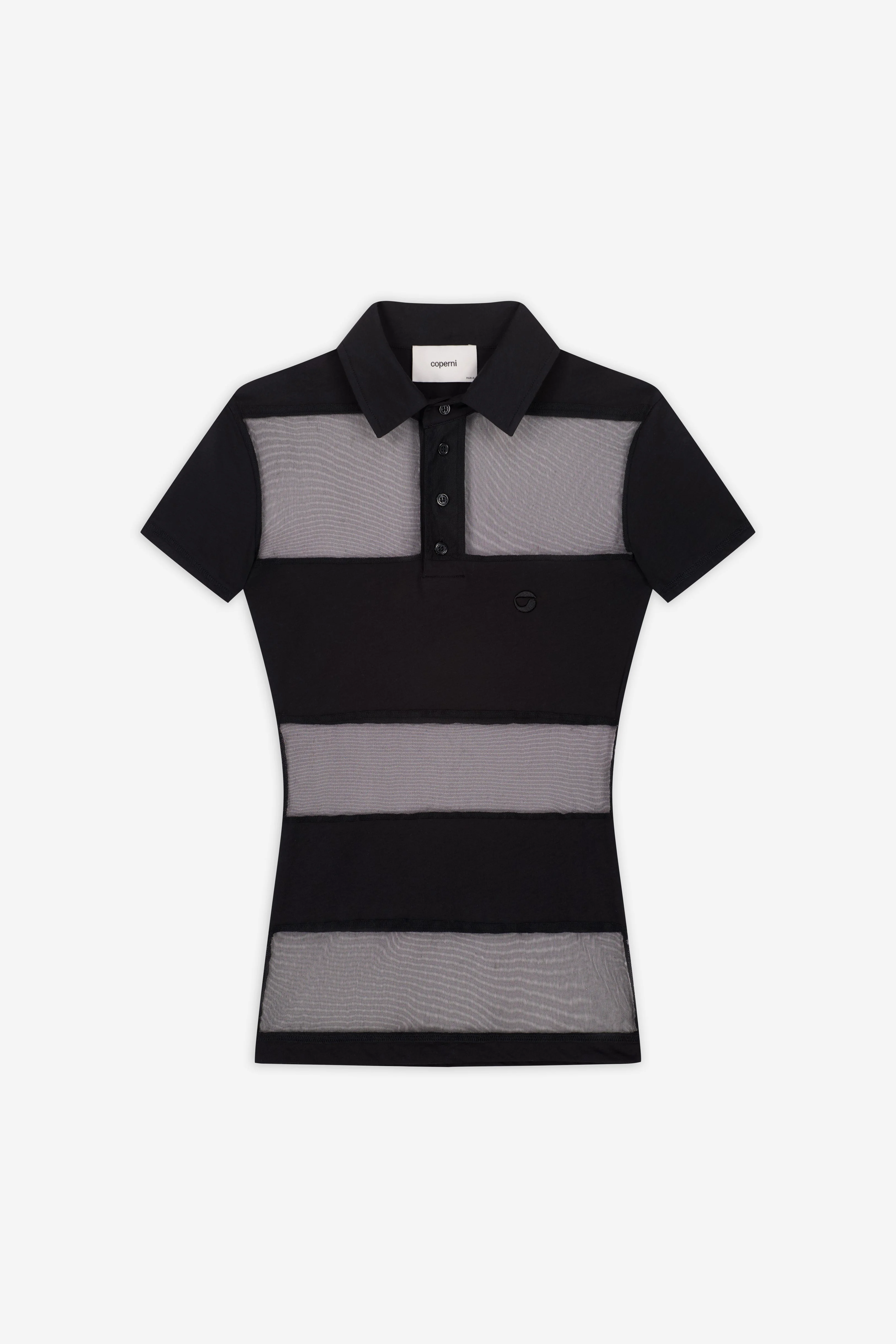 This polo top is constructed from a technical stretch blend with alternating opaque and sheer stripes. The design features a structured collar, a short button placket and a fitted silhouette that follows the body. The transparent bands add a light, graphic contrast, giving the piece a modern edge. Details - Composition: 50%CO 41%PA 9%EA - Made in: Portugal - Sku: COPJS115F5028