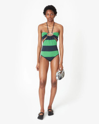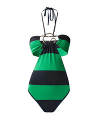 FINAL SALE The Knitted Striped Body in Green and Blue by Coperni is a halter-neck bodysuit that features compelling cut outs, a silver-toned jewelry brooch detail, and bold wide stripes.