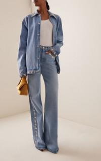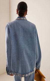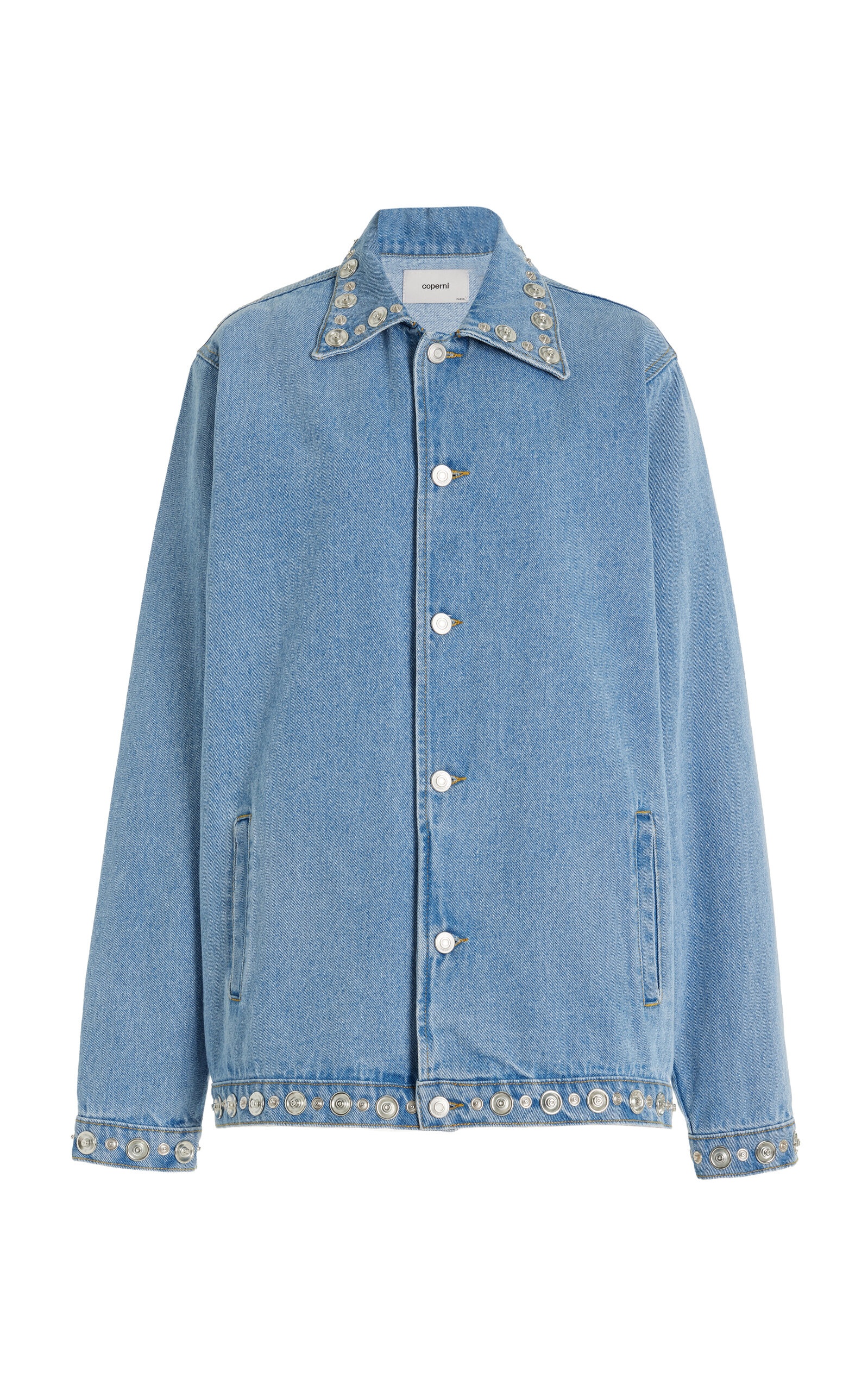 Showcasing their expertise in spinning cool, seemingly minimal pieces from complex constructions, French talents Sebastien Meyer and Arnaud Vaillant offer a range of instantly cult-worthy silhouettes. Crafted from pure cotton denim, this oversized jacket is embellished with brushed silver studs along its edges. PRODUCT DETAILS - Resort '25 - Button fastenings through front - Composition: Denim Cotton - Designer color: Blue Washed - Dry clean - Imported SIZE & FIT - Designed for a relaxed fit