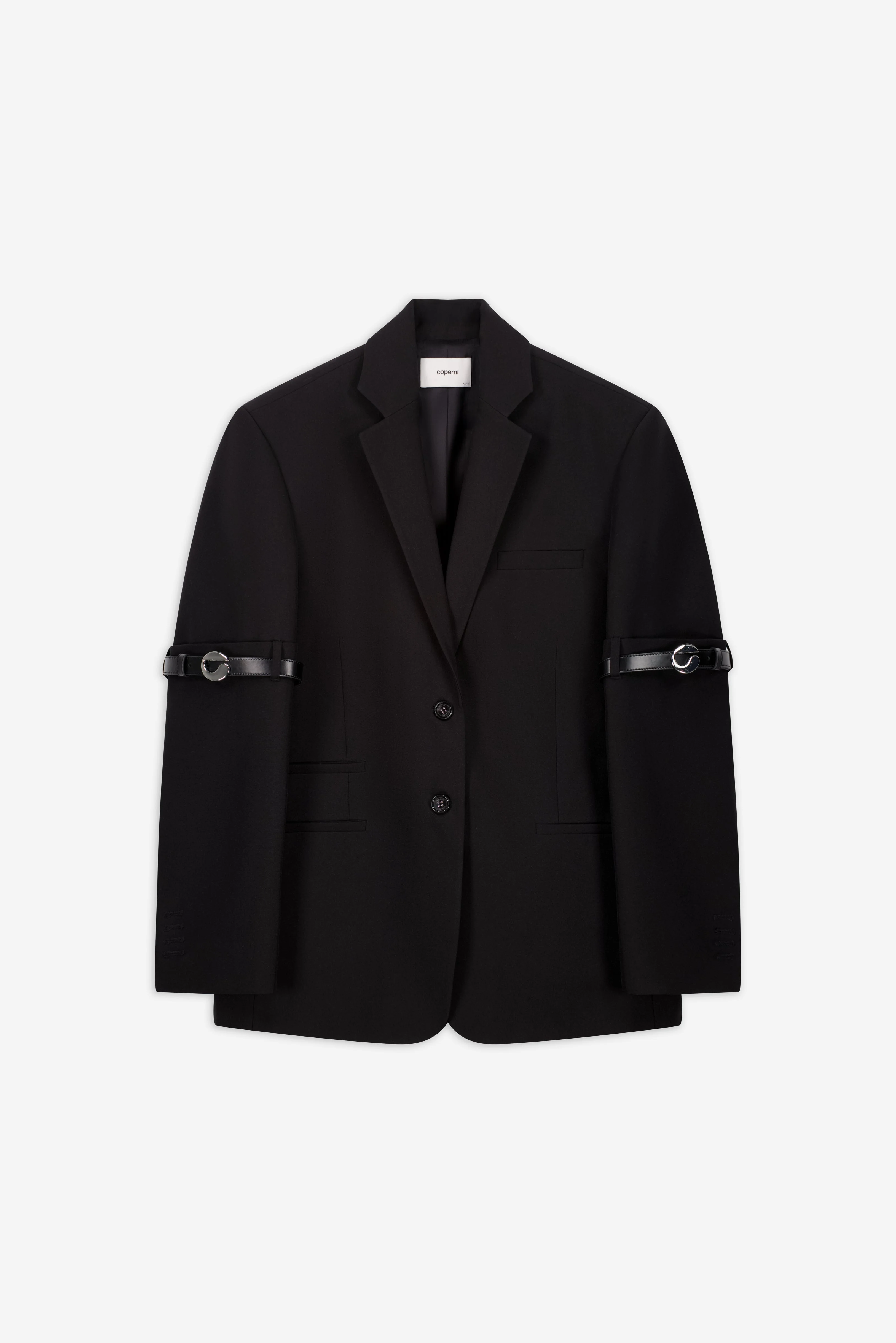 Cut with precision, the Logo Belted Blazer redefines tailoring through modern lens. Its clean silhouette is punctuated by signature Coperni logo straps at the arms. Designed to blur the lines between structure and fluidity, this blazer carries a quiet authority. DETAILS - Composition: Recycled Polyester - Made in: Portugal - Sku: COPV37F3004
