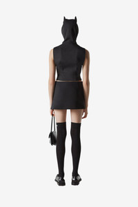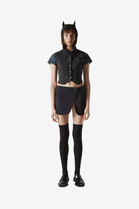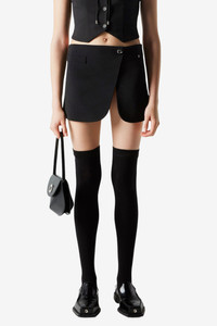 Tailored from a smooth wool-blend, this miniskirt has a curved hem and a sharp diagonal crossover to reveals a decadent thigh-high leg slit. It is secured in place by a silver button in the shape of a C. Details Black COPJ24111 Made in Bulgaria Size and Fit Model is 176 cm / 5.7 ft and wears size 34