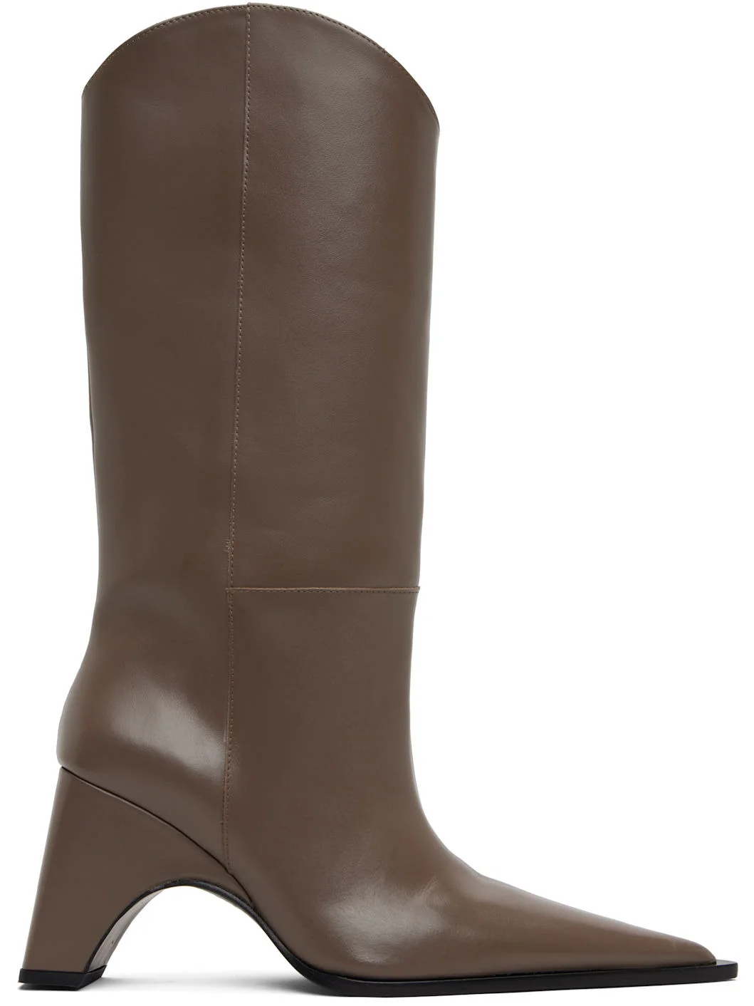 Knee-high buffed calfskin boots. · Pointed toe · Buffed leather lining · Covered block heel with rubber injection · Leather sole · Heel: H3.5" Supplier color: Brown Upper: calfskin. Sole: leather, rubber. Made in Spain 252325F115002