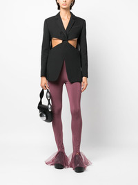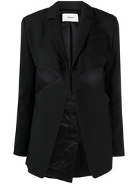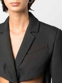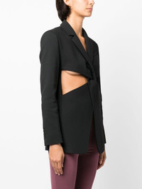 twisted cut-out blazer Coperni offers an alternative take on classic tailoring. This black blazer boasts a twist-front design that's enhanced with skin-baring side cut-outs. Highlights - Black - Recycled polyester blend - Cut-out detailing - Twist detailing - Notched lapels - Side press-stud fastening - Long sleeves - Buttoned cuffs - Chest welt pocket - American rear vent - Curved hem Imported Composition Outer: Recycled Polyester 50%, Viscose 34%, Polyester 14%, Spandex/Elastane 2% Lining: Viscose 52%, Cupro 48% SIZE & FIT Model measurements Height 5 ft 11 in(1.8 m) Bust/Chest 31.49 in(80 cm) Hips 35.43 in(90 cm) Waist 24.4 in(62 cm) FittingInformation Designed for a slim fit that sits just away from the body offering a close yet comfortable fit The vented hem offers movement at the rear Made from a midweight fabric This piece fits true to size – take your usual size Washing instructions Dry Clean Only
