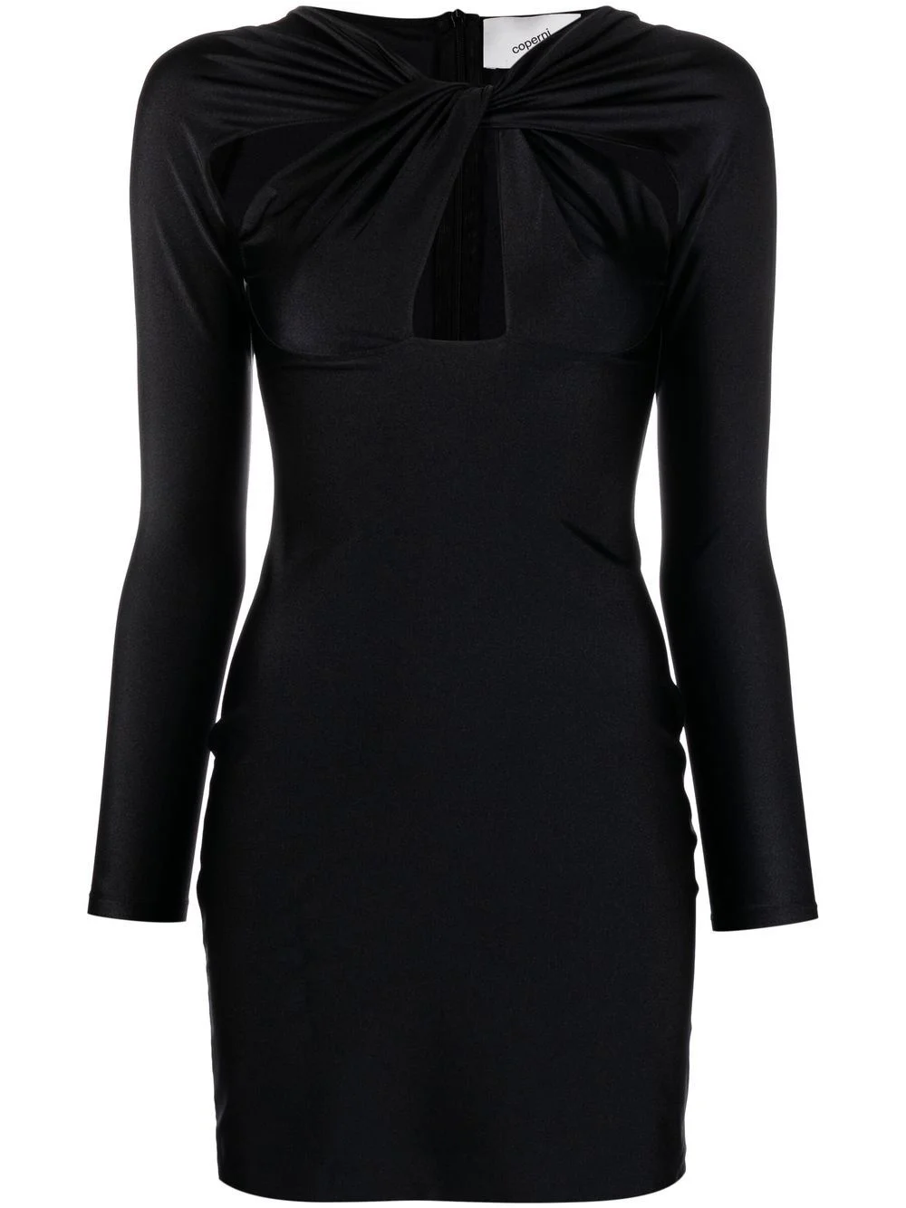 cut-out twisted mini dress Slashed silhouettes with an artful twist dominated Coperni’s SS23 runway. From the collection, this minidress is crafted from black stretch jersey and characterised by a twisted neckline complete with cut-out detailing. Highlights - Black - Slash neck - Cut-out detailing - Long sleeves Imported Composition Polyamide 80%, Elastane 20% SIZE & FIT Model measurements Height 5 ft 10 in(1.79 m) Bust/Chest 31.49 in(80 cm) Hips 35.03 in(89 cm) Waist 23.62 in(60 cm) FittingInformation This piece fits true to size. We recommend you get your regular size Cut for a close fit Made with a mid-weight stretch fabric Washing instructions Machine Wash