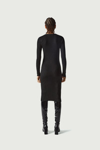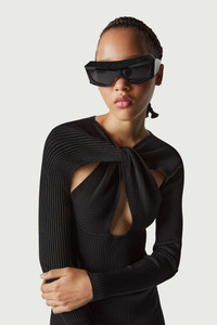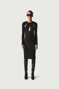 Knee-length black dress with draped cut-out neckline. The thin ribbed texture of this stretch-jersey dress lengthens its silhouette for an enhanced hourglass style. A twisted neckline that knots at the collarbone creates a trio of cut-outs that form a heart-shape. Details Black COPML39600 Size and Fit Model wears size XS
