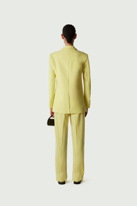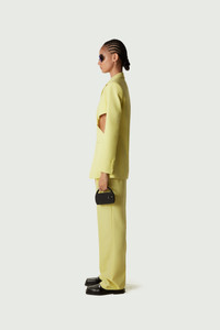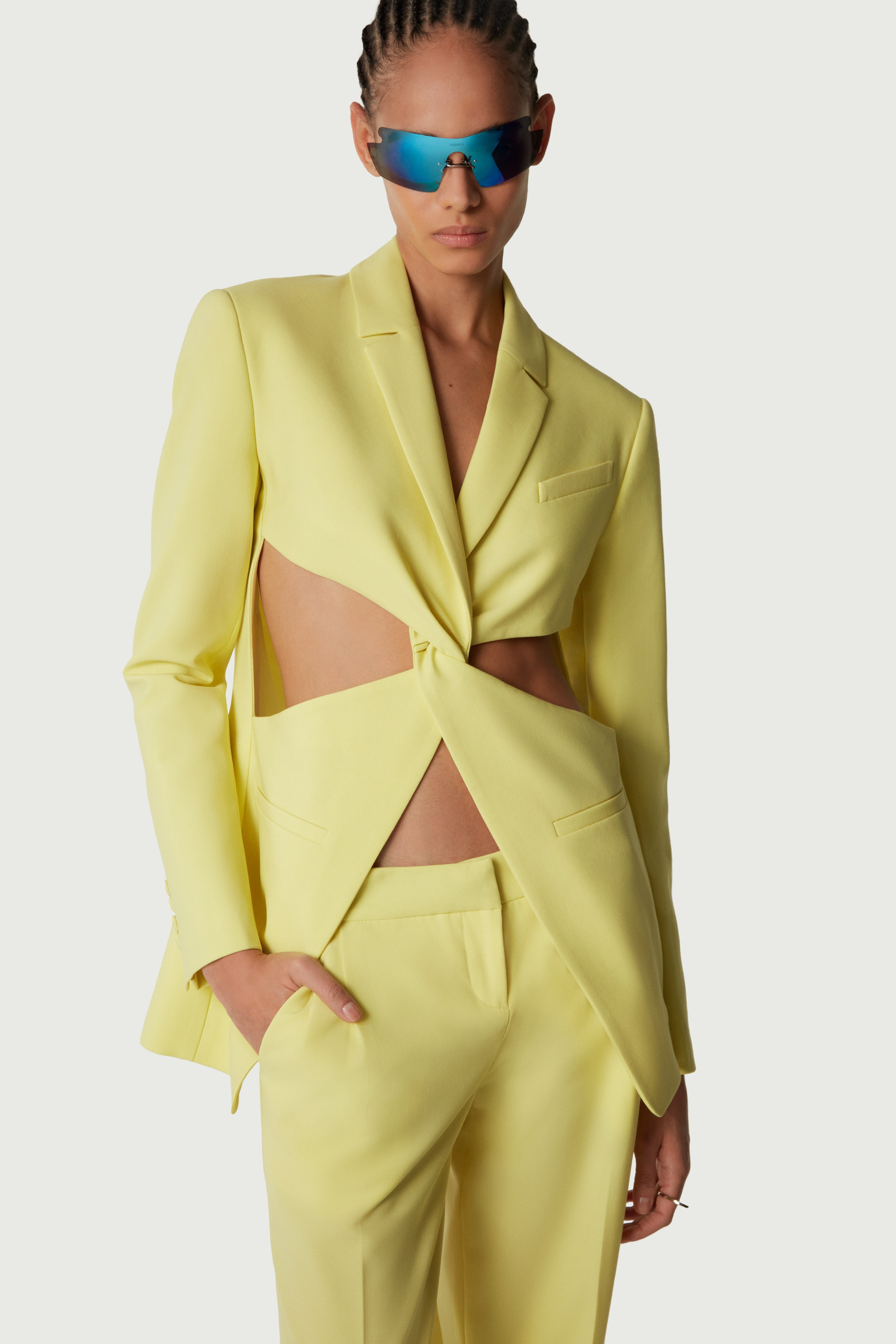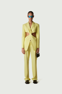 Pastel-yellow blazer with twisted cut-out design. Coperni subverts classic tailoring with an energetic twist to reveals a cut out design that adds a sculptural feel to this slim fitting wool-mix jacket. The silhouette magically opens up thanks to a concealed snap button sewn into one side. With strong shoulders, notched lapels and a single vent at the back, this style honours tradition as well as contemporary innovation. Details Yellow COPV30106 Made in Portugal Size and Fit Model is 177 cm / 5.8 ft and wears size 36