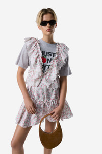 The twisted Princess dress mixes coquettish ruffles, delicate florals and scalloped edges with an audacious cut that skims the thighs and showcases the neckline with a deep plunging V-front. The design connects a flouncy top with a tiered skirt, and can be worn on its own or over a blouse, T-shirt or even a sweatshirt as it was on the Coperni SS25 runway held at Disneyland Paris. Details Print Flowers White COPR167F3043 100% Pu Made in Bulgaria