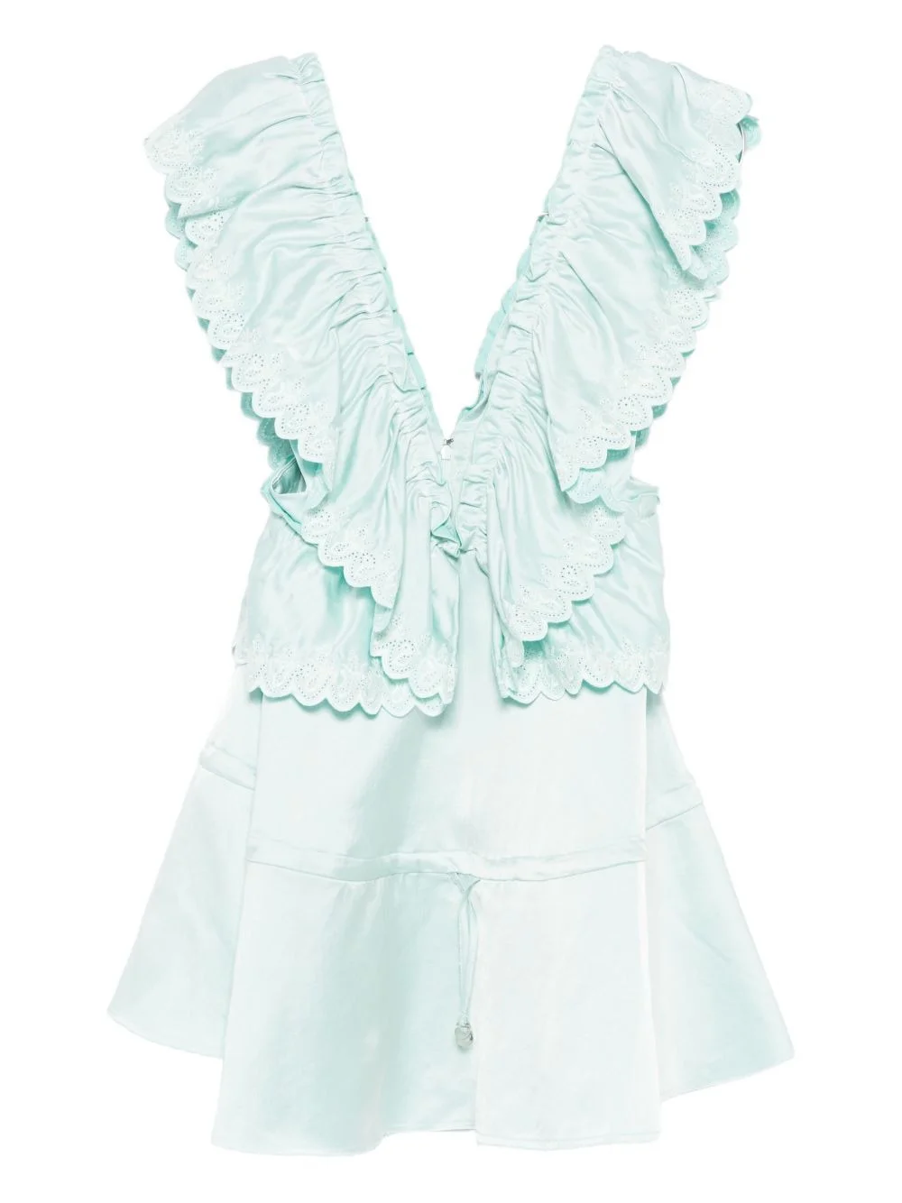 broderie-anglaise ruffled dress Highlights - Light green - Ruffled detailing - Broderie anglaise - Drawstring waist - A-line skirt - Sleeveless Imported Composition Viscose 68%, Linen/Flax 32% SIZE & FIT Model measurements Height 5 ft 9 in(1.75 m) Bust/Chest 32.67 in(83 cm) Hips 36.22 in(92 cm) Waist 24.8 in(63 cm) Washing instructions Dry Clean Only