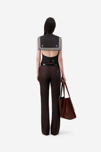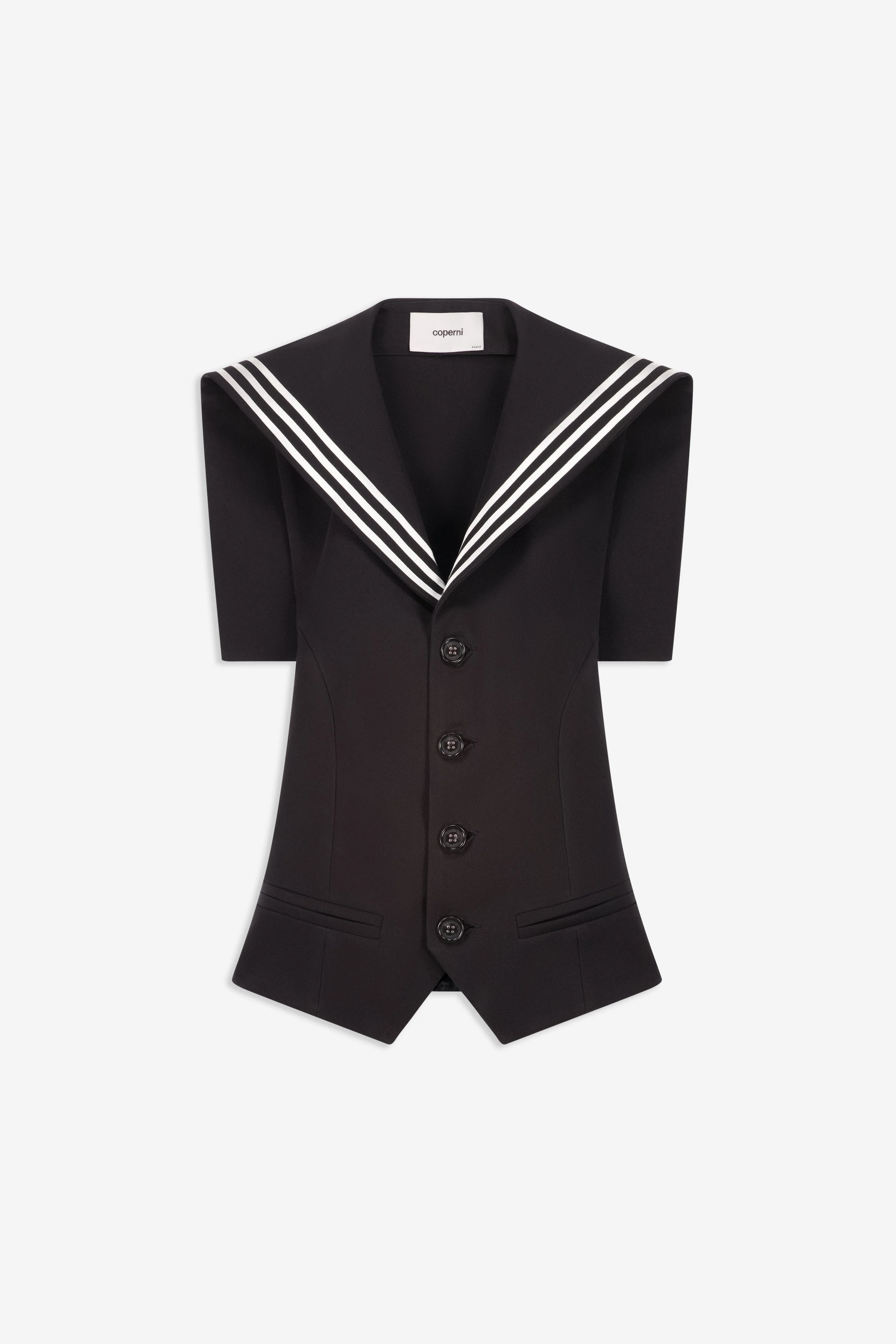 Tailored with precision, the Uniform Vest reimagines classic prep through modern Coperni lens. Cut from smooth technical fabric in black, its clean front silhouette is contrasted by an open back. A sailor collar is finished with delicate white trim and subtle embroidery. DETAILS - Composition: Recycled Polyester - Made in: Italy - Sku: COPT108F3004